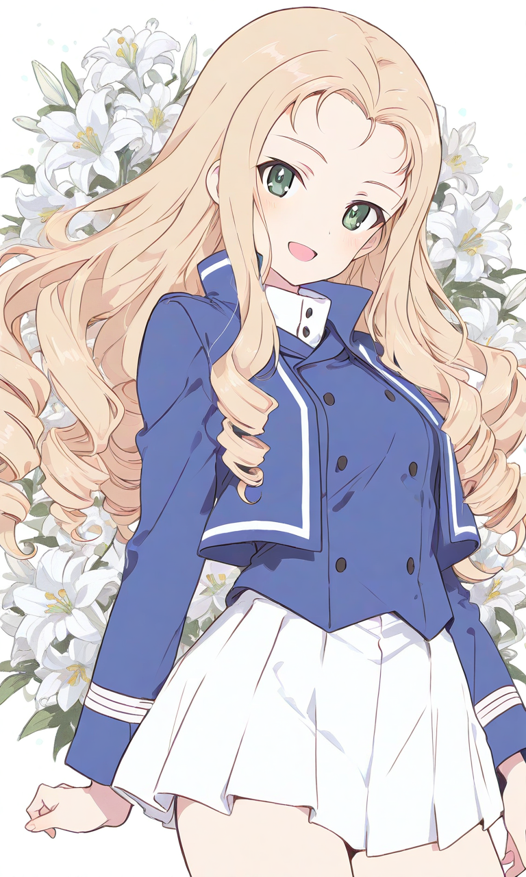 PixAI【Shiitake-Mix】shimada fumikane (style), marie (girls und panzer),hair slicked back, green eyes,blonde hair, bc freedom military uniform, white skirt, smile,open mouth, cowboy shot,white lily, masterpiece,high quality, high resolution,high-res,♡masterpiece, highest quality, ♡,(watercolor_(medium):1.2)(simple coloring,flat color:2)dutch angle,marie (girls und panzer), bc freedom military uniform, bc freedom (emblem), drill hair, blonde hair, green eyes, long hair,
