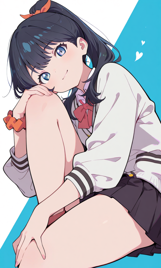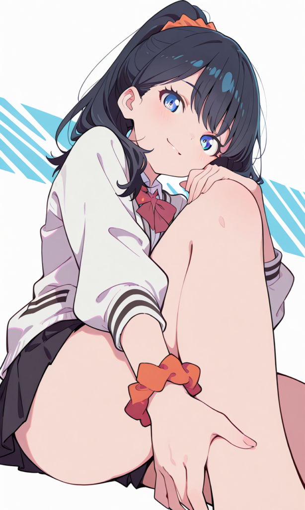 PixAI【Shiitake-Mix】takarada rikka(SSSS.GRIDMAN),school uniform,long sleeves,one wrist scrunchie((right)),ponytail, knee to chest, cowboy shot,smile,from below,masterpiece,high quality, , flat color style, simple coloring style,♡masterpiece, highest quality, ♡