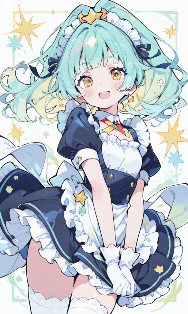 PixAI【Shiitake-Mix】hoshikawa lily,yellow eyes, open mouth, smile,maid,puffy short sleeves, white gloves, white thighhighs, cowboy shot,looking at viewer, masterpiece,high quality, ,♡masterpiece, highest quality, ♡,neon pop art style
