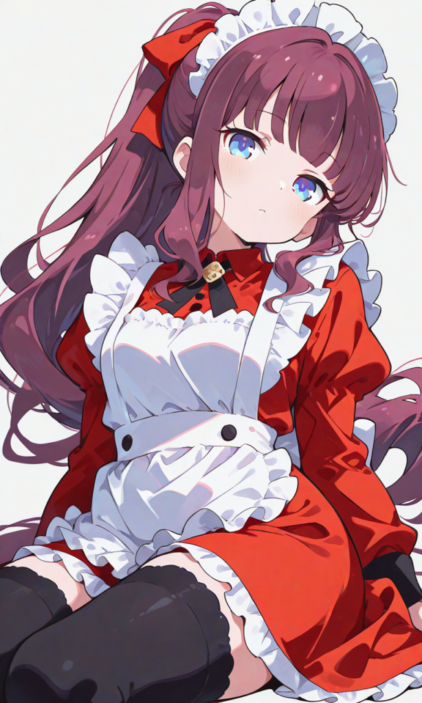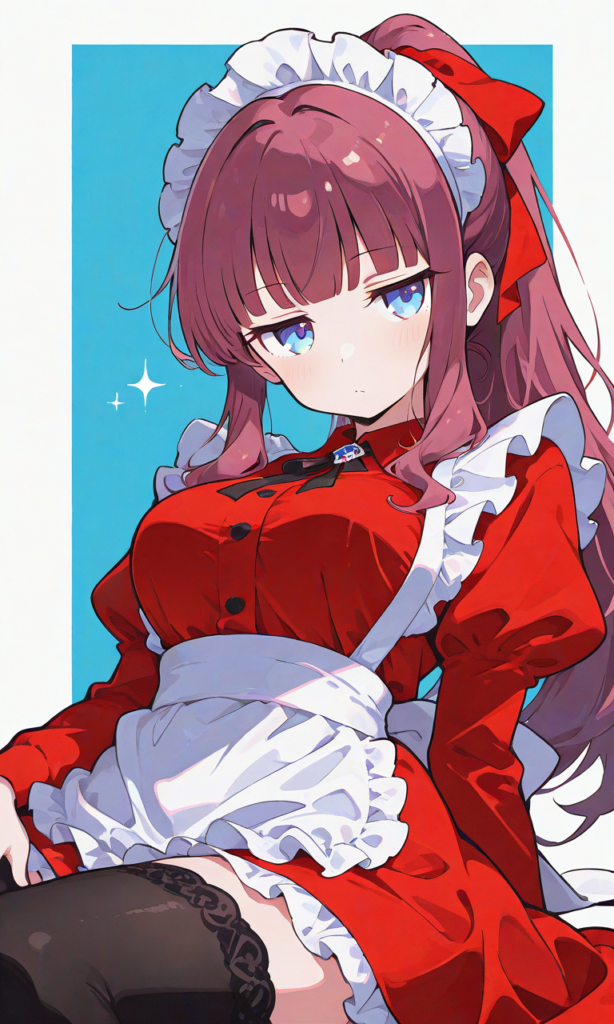 PixAI【Shiitake-Mix】flat color, cel shading, NEW GAME,takimoto hifumi,solo,jitome, ponytail, red hairribbon,maid,red dress, black thighhighs,looking at viewer, cowboy shot,sitting, from below, simple background, minimalism,masterpiece,high resolution,high quality, ,high-res,neon pop art style,♡masterpiece, highest quality, ♡,