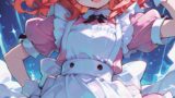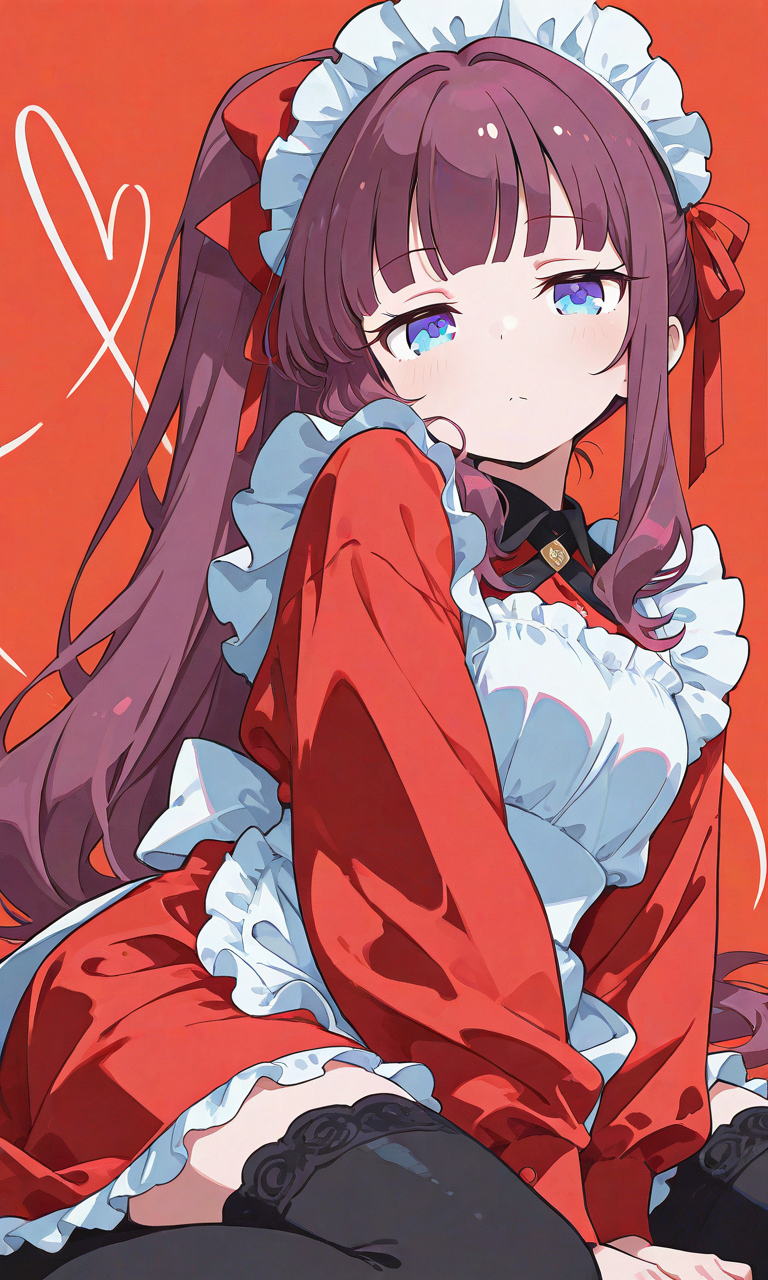 PixAI【Shiitake-Mix】flat color, cel shading, NEW GAME,takimoto hifumi,solo,jitome, ponytail, red hairribbon,maid,red dress, black thighhighs,looking at viewer, cowboy shot,sitting, from below, simple background, minimalism,masterpiece,high resolution,high quality, ,high-res,neon pop art style,♡masterpiece, highest quality, ♡,