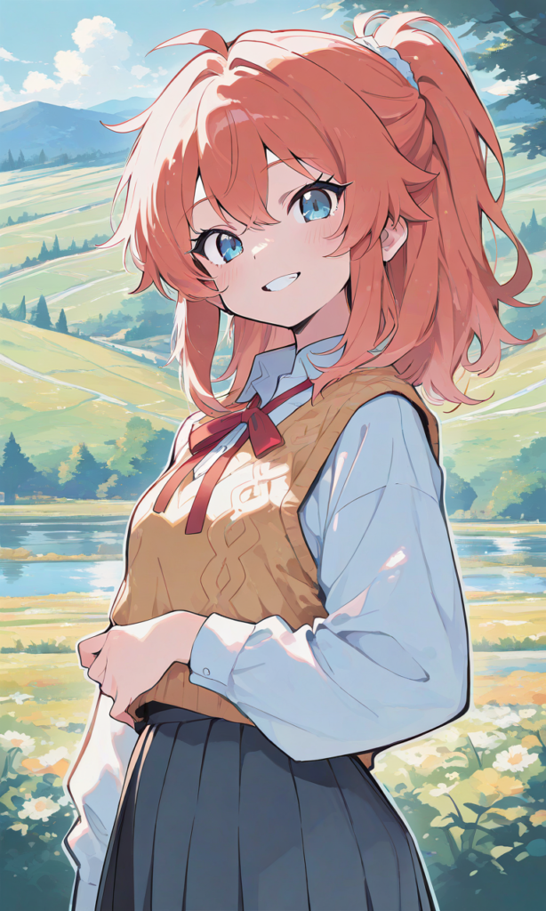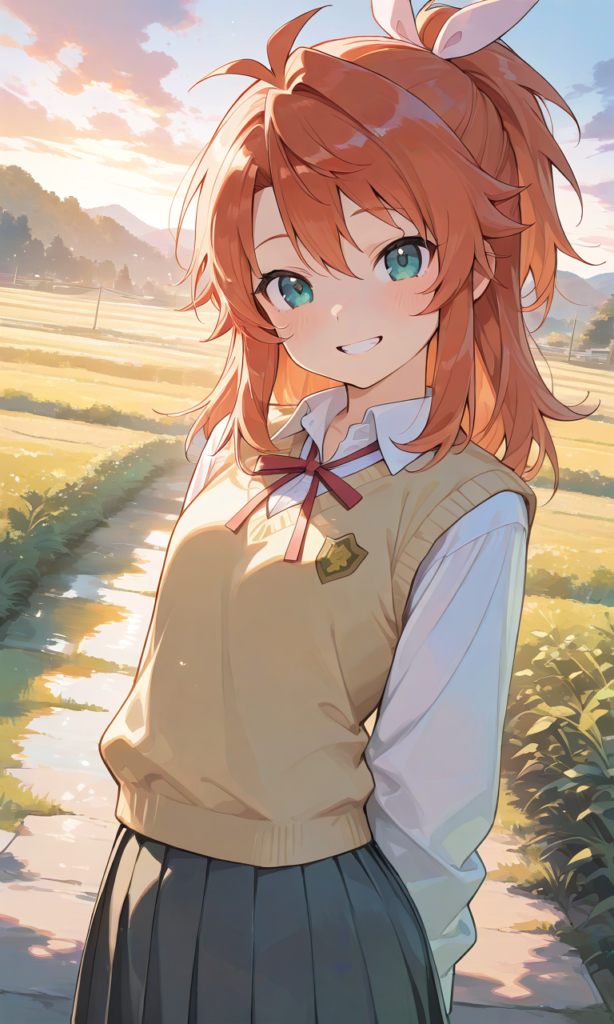 PixAI【Shiitake-Mix】nonnon biyori,koshigaya natsumi,solo,school uniform, smile,teeth,sweater vest, white shirt, pleated skirt, standing, long sleeves,upper body, rural scenery,((4k,8k,Ultra HD)),((Masterpiece :1.2)),((Best quality :1.2)),((Detailed :1.5)),((Detailed background :1.5)),high-res,♡masterpiece, highest quality, ♡
