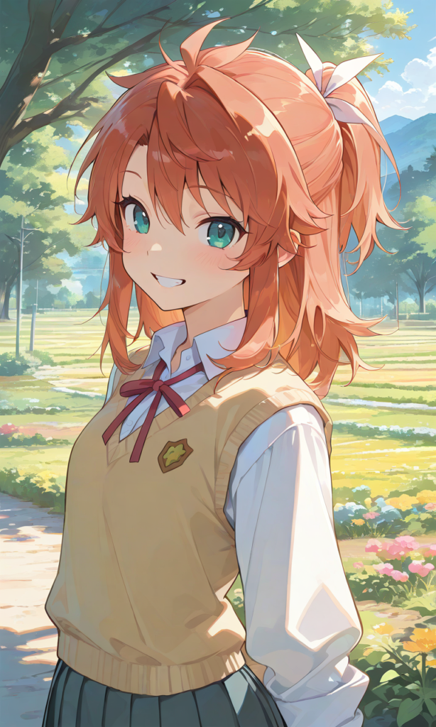 koshigaya natsumi(nonnon biyori),solo, ponytail,medium hair, white hairribonn,school uniform, smile,teeth,knit vest, white shirt, pleated skirt,red neckribbon, standing, long sleeves,upper body, rural scenery,((4k,8k,Ultra HD)),((Masterpiece :1.2)),((Best quality :1.2)),((Detailed :1.5)),((Detailed background :1.5)),high-res,♡masterpiece, highest quality, ♡,neon pop art style,{masterpiece},{chibi} ,{chibi style anime illustration},{Deformed},{best quality}, {illustration},{thick outline},{outlined vector graphics},{2d cel anime},{flat color style},{simple coloring style},Only one person depicted, big eyes, a short limbs,