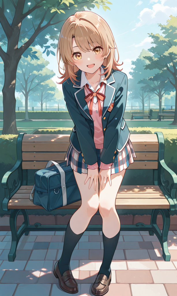 isshiki iroha,solo, smile,school uniform,blazer, plaid skirt,neck ribbon,pink sweater, full body, smile, open mouth,knees together feet apart,pigeon-toed, standing,park bench, masterpiece,high quality, ,♡masterpiece, highest quality, ♡