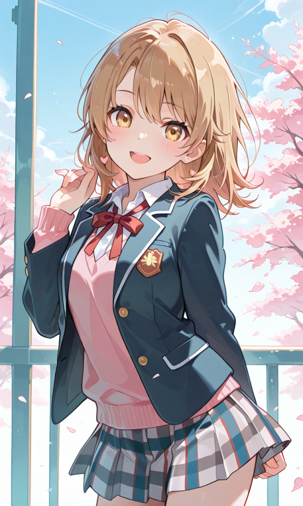 isshiki iroha,solo, smile,school uniform,blazer, plaid skirt,neck ribbon,pink sweater, cowboy shot,smile, open mouth,masterpiece,high quality, ,♡masterpiece, highest quality, ♡
