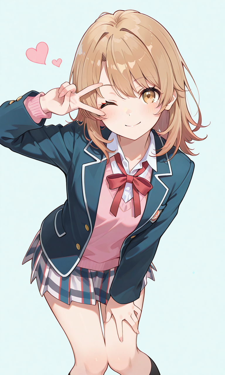 PixAI【Shiitake-Mix】isshiki iroha,solo, smile,school uniform,blazer, plaid skirt,neck ribbon,pink sweater, cowboy shot, smile, one eye closed,v over eye, knees together feet apart,pigeon-toed, standing,simple background, masterpiece,high quality, ,♡masterpiece, highest quality, ♡,