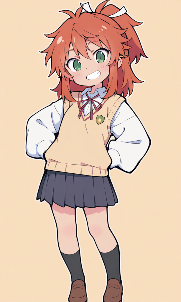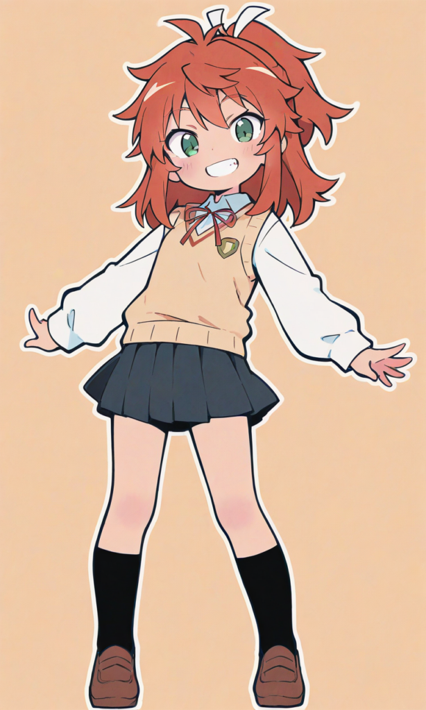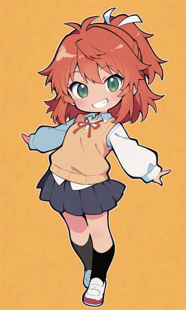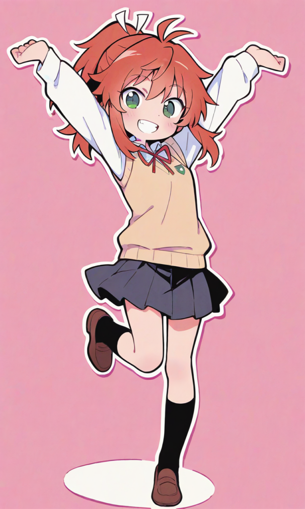 PixAI【Shiitake-Mix】nonnon biyori,koshigaya natsumi,solo,school uniform, smile,teeth,sweater vest, white shirt, pleated skirt, standing, long sleeves,full body,black socks,looking at viewer,drop shadow, skipping, arms up, spread arms, high-res,{masterpiece},{chibi} ,{chibi style anime illustration},{Deformed},{best quality}, {illustration},{thick outline},{outlined vector graphics},{2d cel anime},{flat color style},{simple coloring style},Only one person depicted, big eyes, a short limbs,neon pop art style