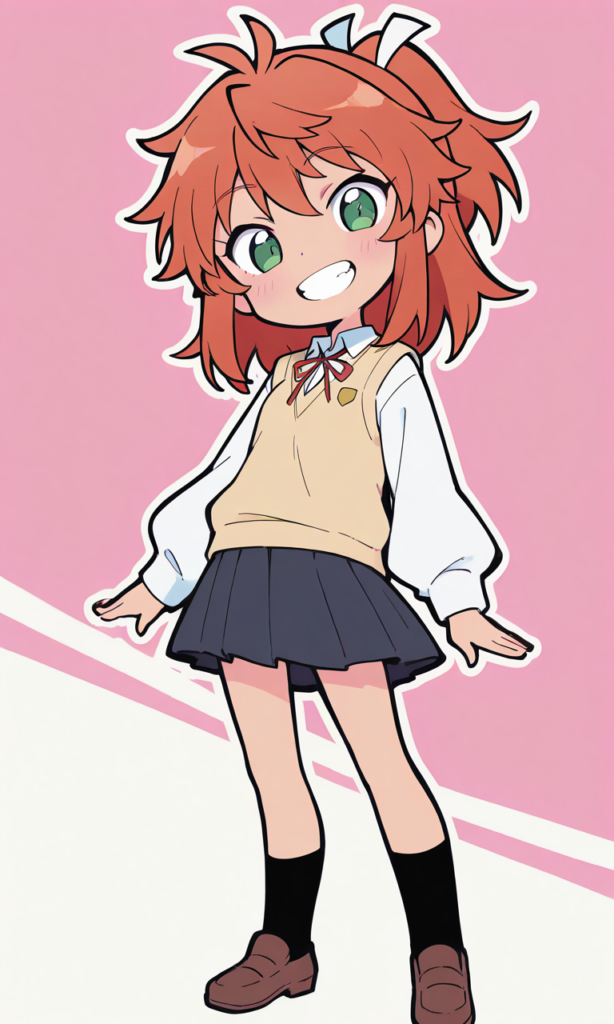 nonnon biyori,koshigaya natsumi,solo,school uniform, smile,teeth,sweater vest, white shirt, pleated skirt, standing, long sleeves,full body,black socks,looking at viewer, high-res,{masterpiece},{chibi} ,{chibi style anime illustration},{Deformed},{best quality}, {illustration},{thick outline},{outlined vector graphics},{2d cel anime},{flat color style},{simple coloring style},Only one person depicted, big eyes, a short limbs,neon pop art style