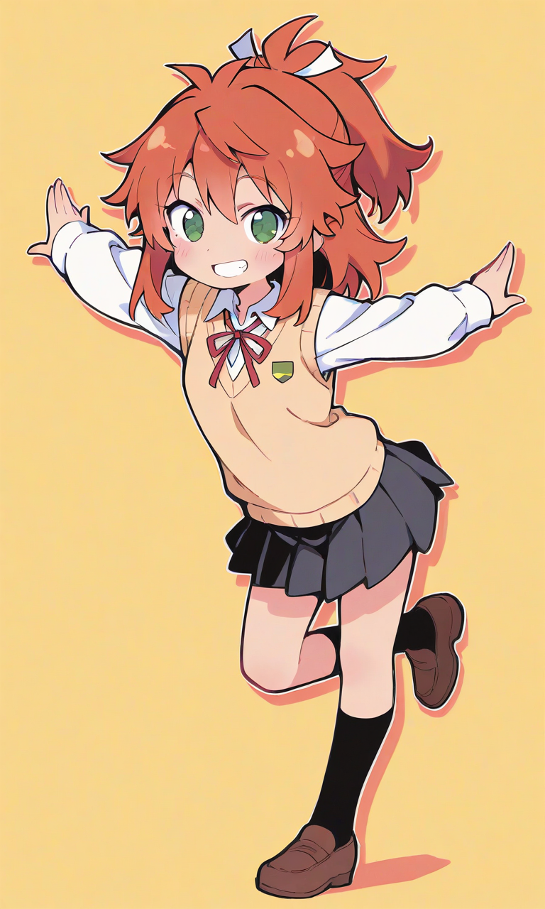 PixAI【Shiitake-Mix】nonnon biyori,koshigaya natsumi,solo,school uniform, smile,teeth,sweater vest, white shirt, pleated skirt, standing, long sleeves,full body,black socks,looking at viewer,drop shadow, skipping, arms up, spread arms, high-res,{masterpiece},{chibi} ,{chibi style anime illustration},{Deformed},{best quality}, {illustration},{thick outline},{outlined vector graphics},{2d cel anime},{flat color style},{simple coloring style},Only one person depicted, big eyes, a short limbs,neon pop art style