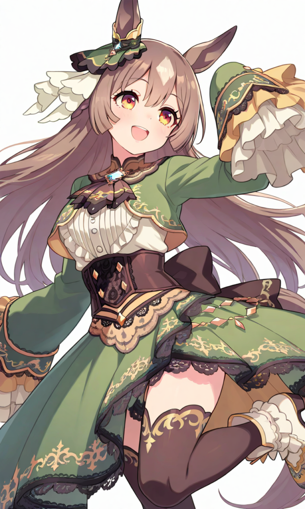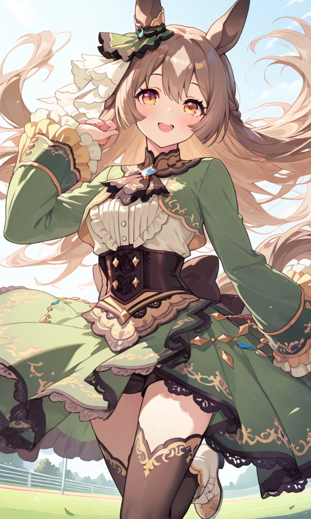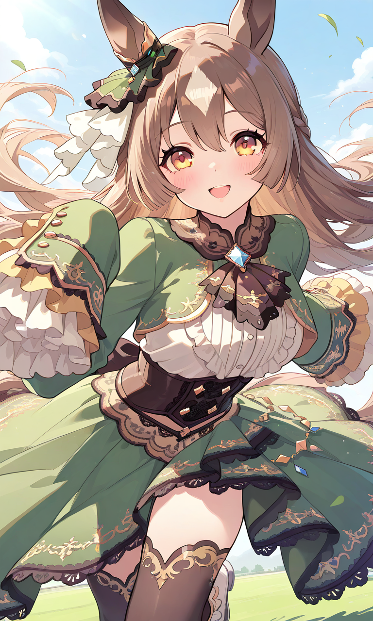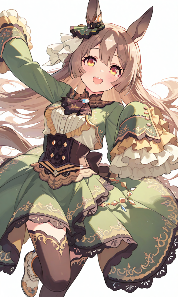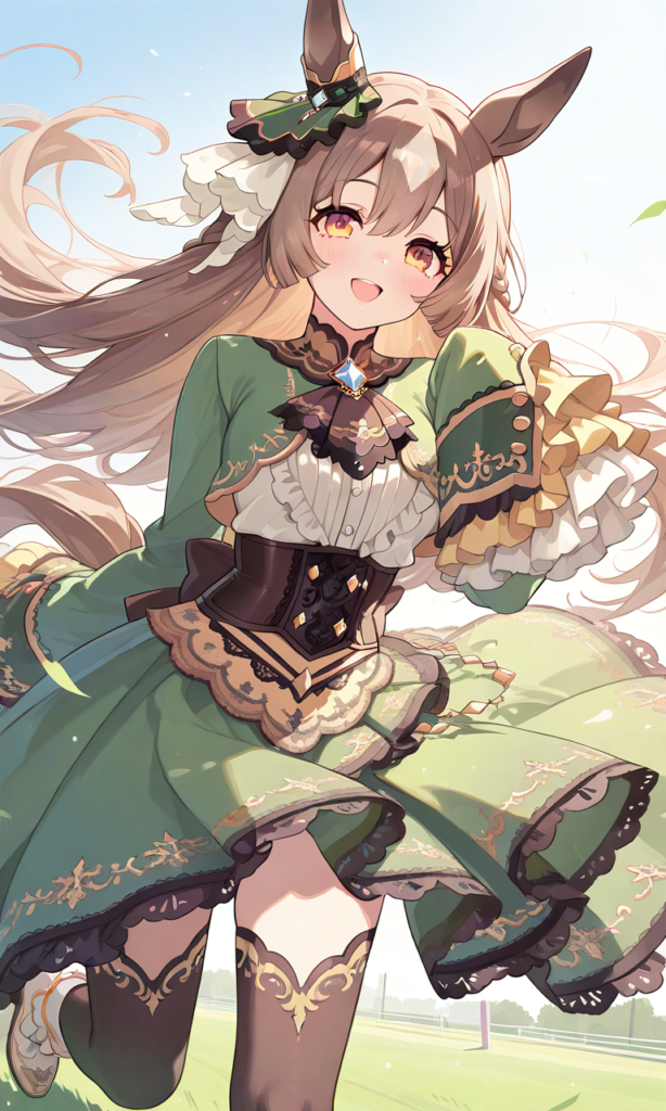PixAI【Shiitake-Mix】satono diamond (umamusume), smile, open mouth, looking at viewer, running, wind lift, cowboy shot, masterpiece, high quality, high resolution, high-res, ear ornament, horse ears, half updo, sleeves past wrists, brown ascot, underbust corset, white frilled long sleeves, horse tail, white frilled shirt, lace-trimmed high-low skirt, green dress, brown thighhighs, white ankle boots, ♡masterpiece, highest quality, ♡
