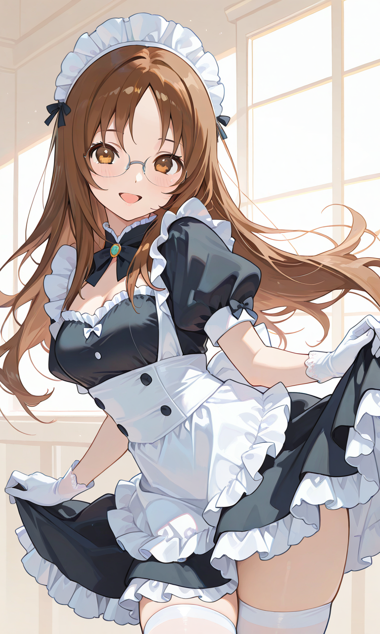 PixAI【Shiitake-Mix】1girl, yamanaka sawako, glasses, maid outfit, white gloves, puffy short sleeves, white thighhighs, smile, open mouth, looking at viewer, cowboy shot, masterpiece, high quality, high resolution, ♡masterpiece, highest quality, ♡