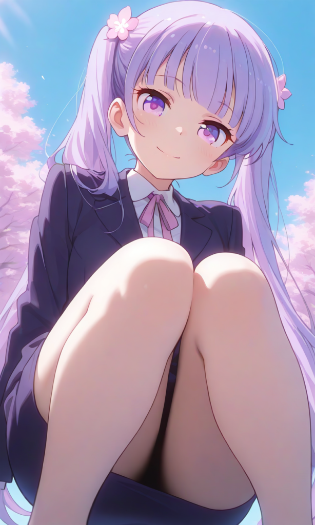 , park,blue sky, from below, cowboy shot,masterpiece,high quality, high resolution,high-res,Shining Style Art, masterpiece, best quality, very aesthetic, highres, absurdres,aoba-su, 1girl, purple eyes, twintails, purple hair, bangs, long hair, very long hair, hair ornament, flower, hair flower,hyper-detailed, high contrast, depth of field, ray tracing, best lighting, cinematic composition, beautiful face, beautiful eyes, sharp focus, (masterpiece:1.2), (best quality:1.2), (very aesthetic:1.2), (absurdres:1.2), (detailed background),