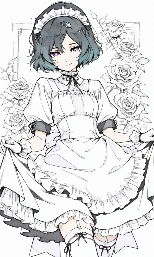 urushibara ruka(STEINS;GATE), smile,miko,hair ornament, maid, white gloves, white thighhighs, cowboy shot,rose,masterpiece,high quality, ,pny_style,urushibara ruka, solo, Purple eyes, black hair, short hair,((sketch-like_outlines, watercolor_coloring, watercolor_texture, japanese_style, best_quality, ultra_detailed, lineart-heavy_style, sketch_style)),greyscale, monochrome, sk3tch, hatching/(texture/),(watercolor_(medium):1.2)(simple coloring,flat color:2)dutch angle