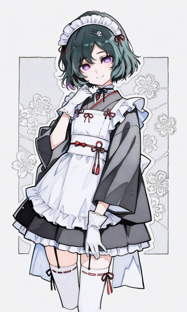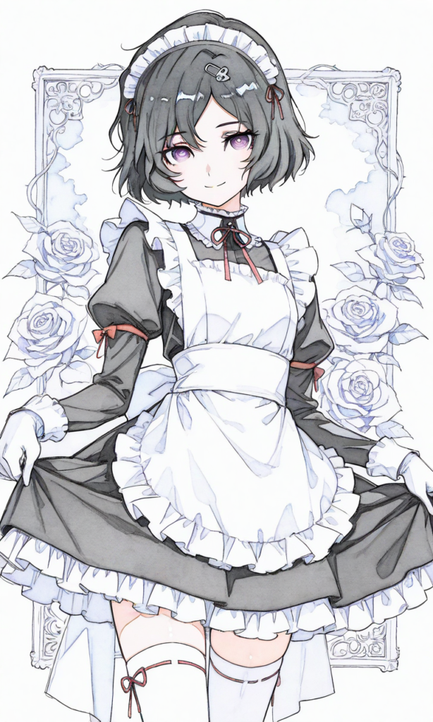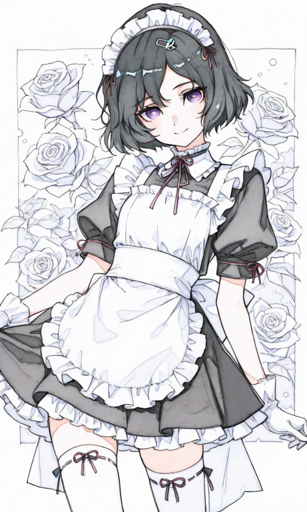 PixAI【Shiitake-Mix】urushibara ruka(STEINS;GATE), smile,miko,hair ornament, maid, white gloves, white thighhighs, cowboy shot,rose,masterpiece,high quality, ,pny_style,urushibara ruka, solo, Purple eyes, black hair, short hair,((sketch-like_outlines, watercolor_coloring, watercolor_texture, japanese_style, best_quality, ultra_detailed, lineart-heavy_style, sketch_style)),greyscale, monochrome, sk3tch, hatching/(texture/),watercolor, sketch style, watercolor effect, pastel colors