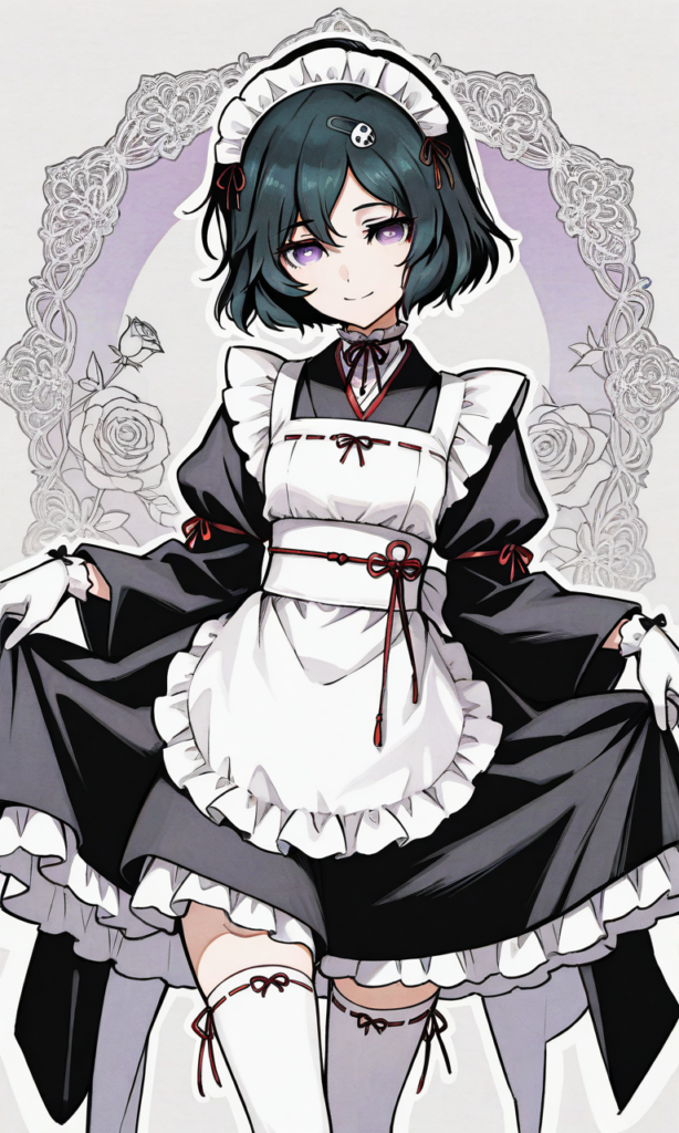 urushibara ruka(STEINS;GATE), smile,miko,hair ornament, maid, white gloves, white thighhighs, cowboy shot,rose,masterpiece,high quality, ,pny_style,urushibara ruka, solo, Purple eyes, black hair, short hair,Black and Grey, crosshatching, dark aesthetic, clean, background texture, bold outline, abstract, cropped, cropped background, ultra detailed,((sketch-like_outlines, watercolor_coloring, watercolor_texture, japanese_style, best_quality, ultra_detailed, lineart-heavy_style, sketch_style)),