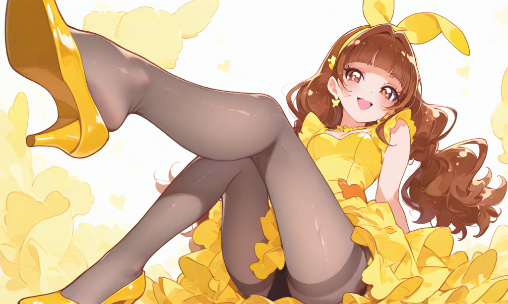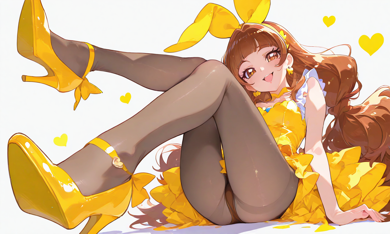 PixAI【Shiitake-Mix】amanogawa kirara(precure), 1girl, smile, open mouth, brown eyes, yellow ((bunnygirl)), pantyhose, pumps, sitting, pumps focus, from below, feet up, full body, minimalism, masterpiece, high resolution, high quality, high-res, shiny skin, shiny, ♡masterpiece, highest quality, ♡