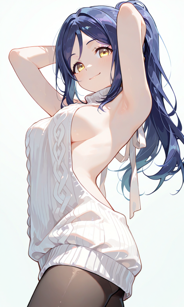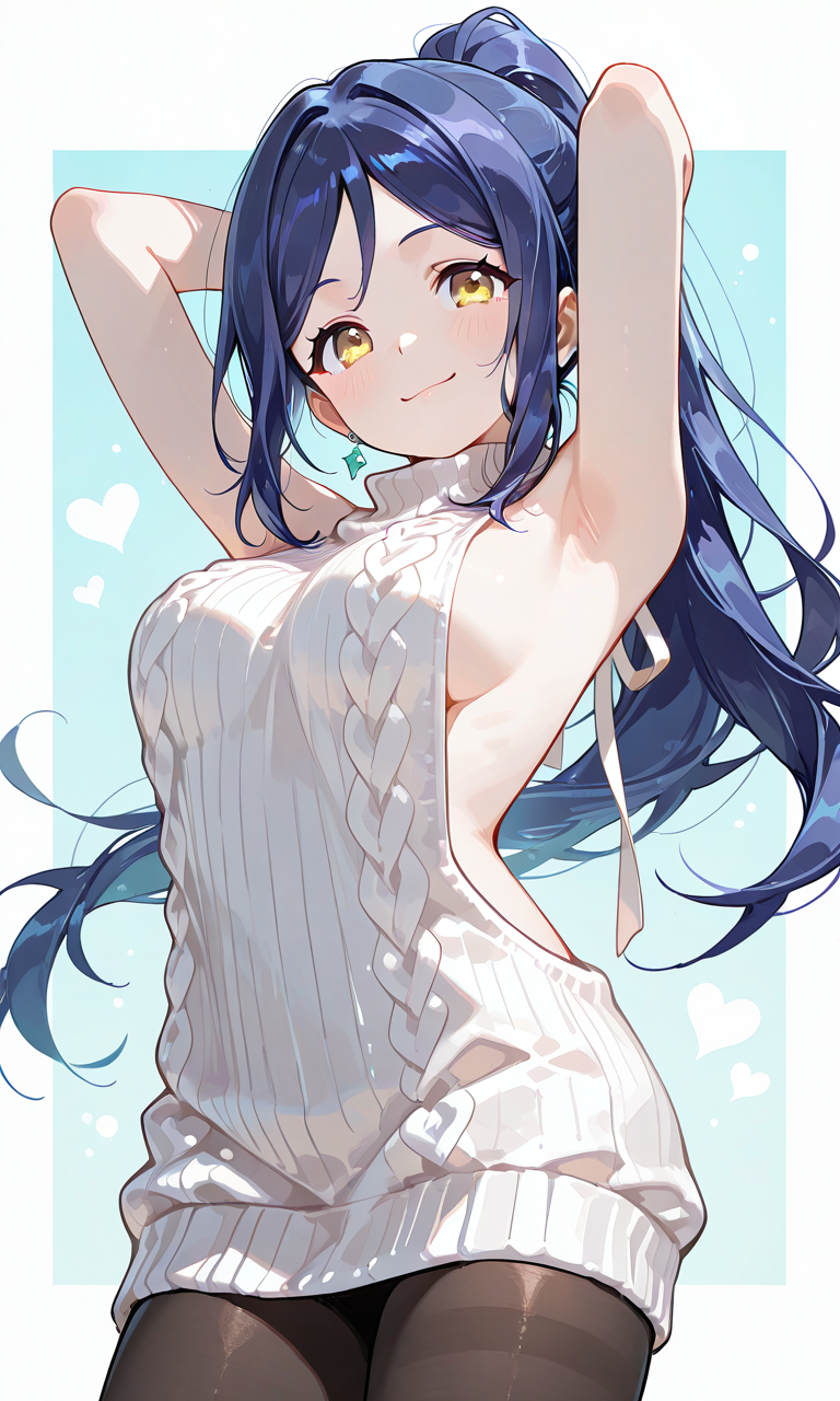 PixAI【Shiitake-Mix】matsuura kanan(lovelive), 1girl, ((yellow eyes)), smile, virgin_killer_sweater, white_sweater, pantyhose, arms_behind_head, cowboy_shot, from_below, armpit_focus, from_side, minimalism, masterpiece, high_quality, high_resolution, ♡masterpiece, highest_quality, ♡, neon_pop_art_style