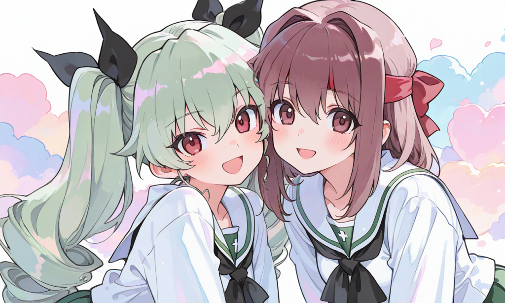 PixAI【Shiitake-Mix】2girls,girls und panzer, kondou taeko(red ribon), anchovy,ooarai school uniform, long sleeves, smile,open mouth, looking at viewer, cowboy shot,simplebackground,masterpiece,high quality, high resolution,♡masterpiece, highest quality, ♡,high-res,watercolor, sketch style, watercolor effect, pastel colors