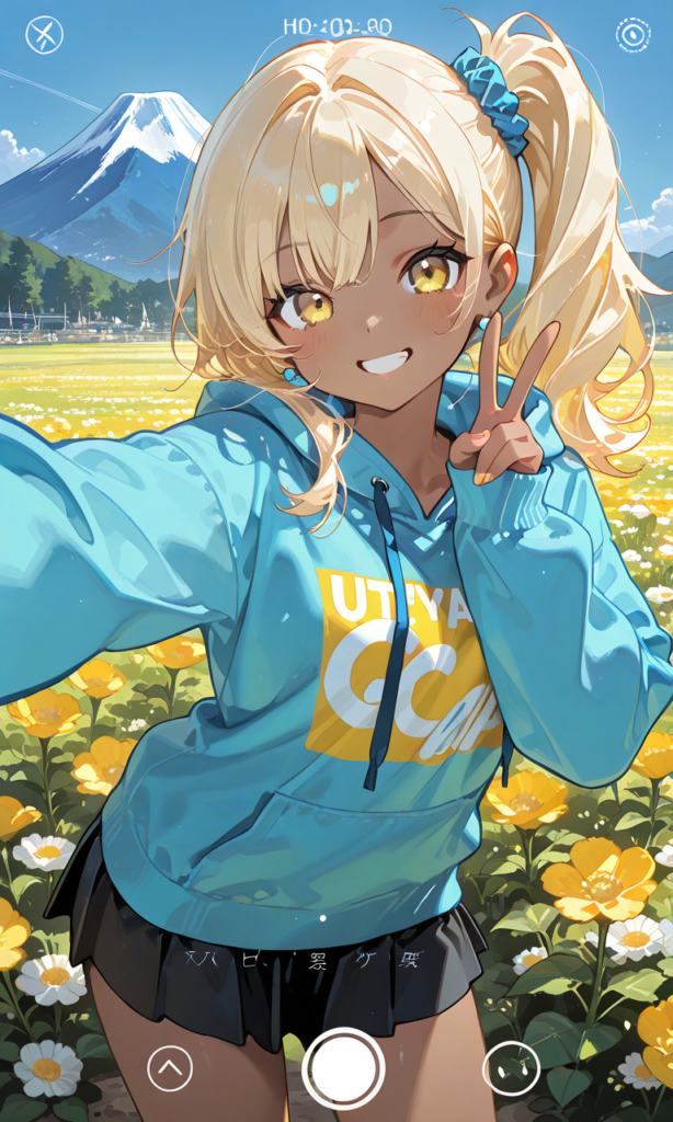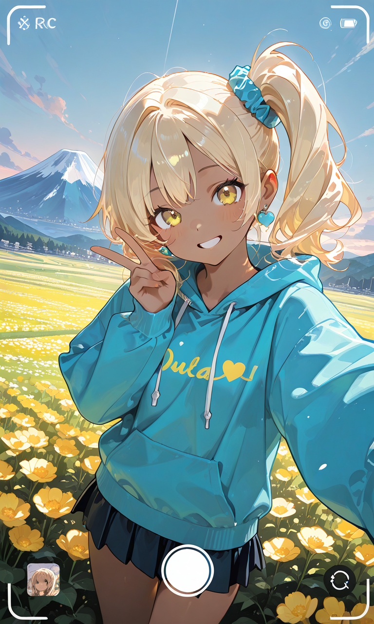 (thick outline),(outlined vector graphics),(2d cel anime),(flat color style),1girl,solo,blonde hair, side ponytail, yellow eyes, dark skin, hoodie, grin, miniskirt, selfie, v,fake phone screenshot,wide shot, cowboy shot,masterpiece,high resolution,high quality, flower field, mount fuji, ,♡masterpiece, highest quality, ♡,((4k,8k,Ultra HD)),((Masterpiece :1.2)),((Best quality :1.2)),((Detailed :1.5)),((Detailed background :1.5))(thick outline),(outlined vector graphics),(2d cel anime),(flat color style),1girl,solo,blonde hair, side ponytail, yellow eyes, dark skin, hoodie, grin, miniskirt, selfie, v,fake phone screenshot,wide shot, cowboy shot,masterpiece,high resolution,high quality, flower field, mount fuji, ,♡masterpiece, highest quality, ♡,((4k,8k,Ultra HD)),((Masterpiece :1.2)),((Best quality :1.2)),((Detailed :1.5)),((Detailed background :1.5))