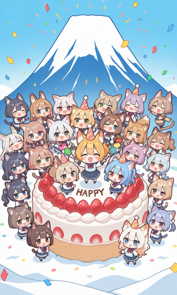 multiple girls, fox girl, cat girl, rabbit girl, chibi, super deformed, party hats, holding cake, mount fuji cake, “富士山の日 おめでとう” flag, mount fuji (background), snow-capped, confetti, balloons, colorful, happy, celebration, kawaii, chibi style, rounded shading, soft shading, joyful expression, smiling, cheerful, masterpiece, ultra-detailed