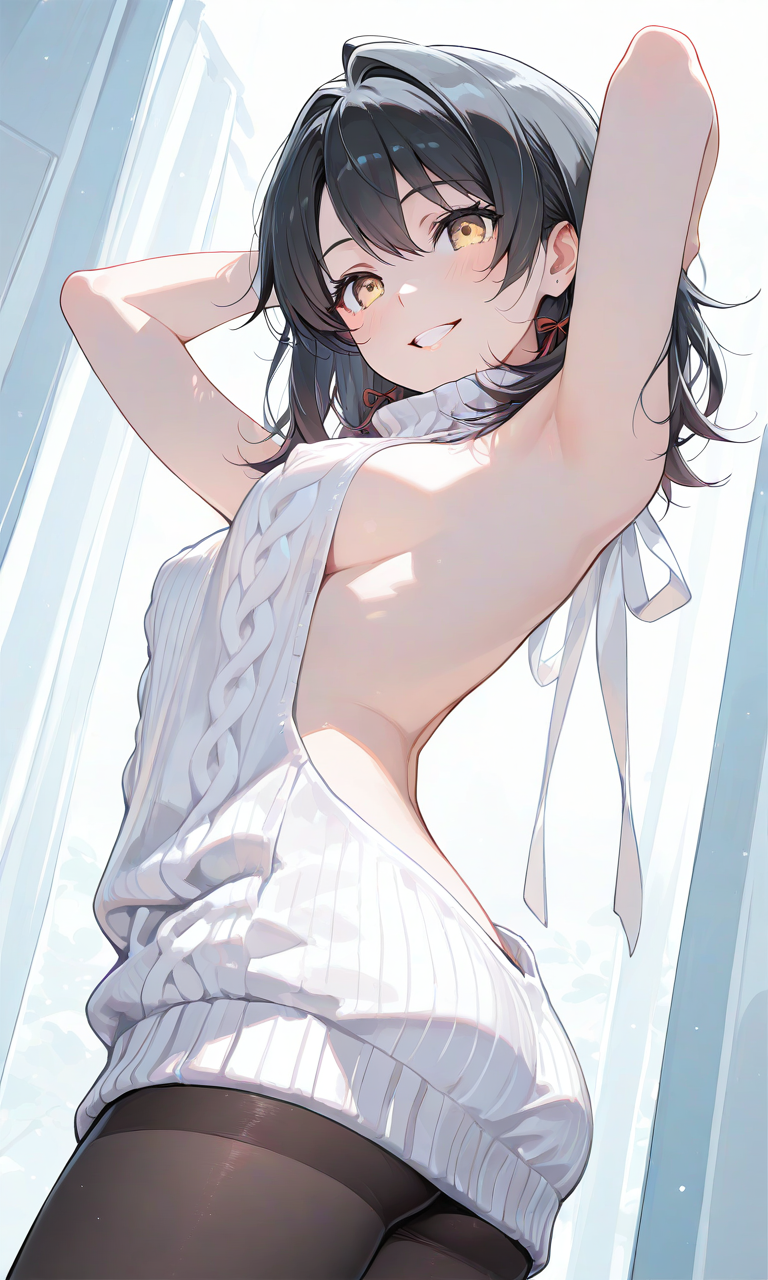PixAI【Shiitake-Mix】yukinoshita haruno,black hair, yellow eyes,virgin killer sweater,white sweater, arms behind head, pantyhose,cowboy shot,grin, from below,from side, masterpiece,high quality, high resolution,high-res,♡masterpiece, highest quality, ♡