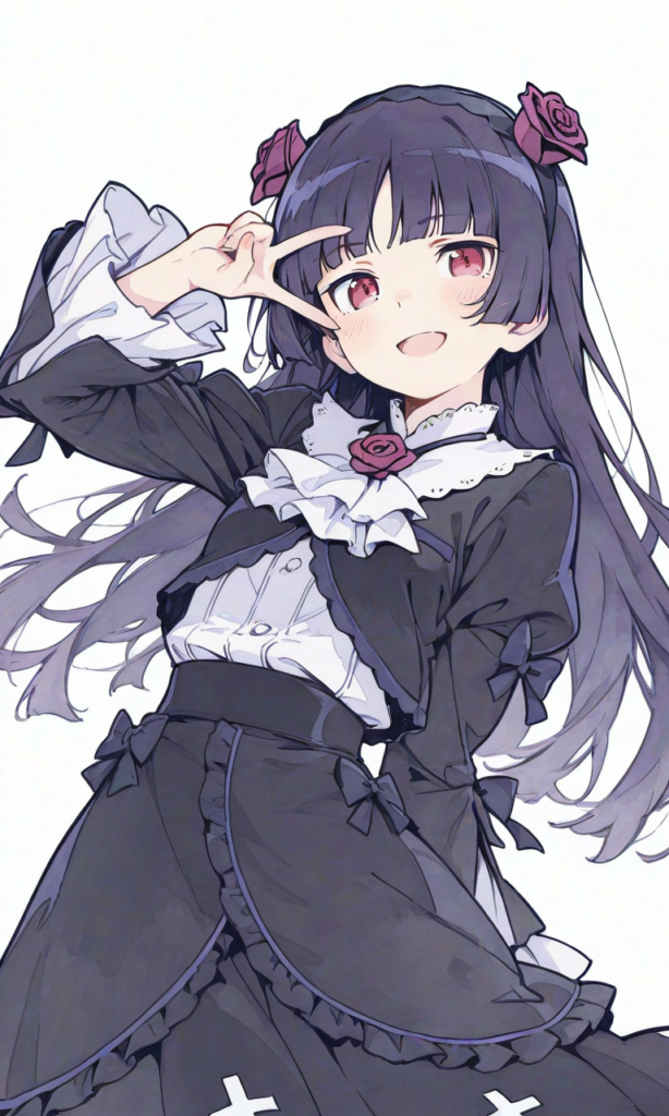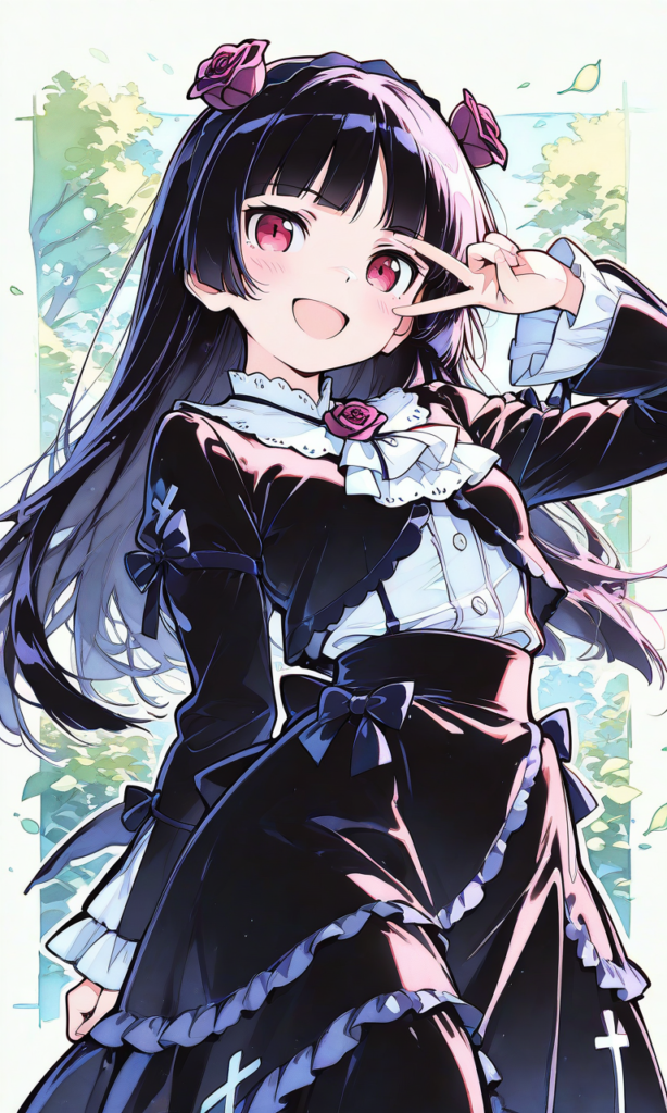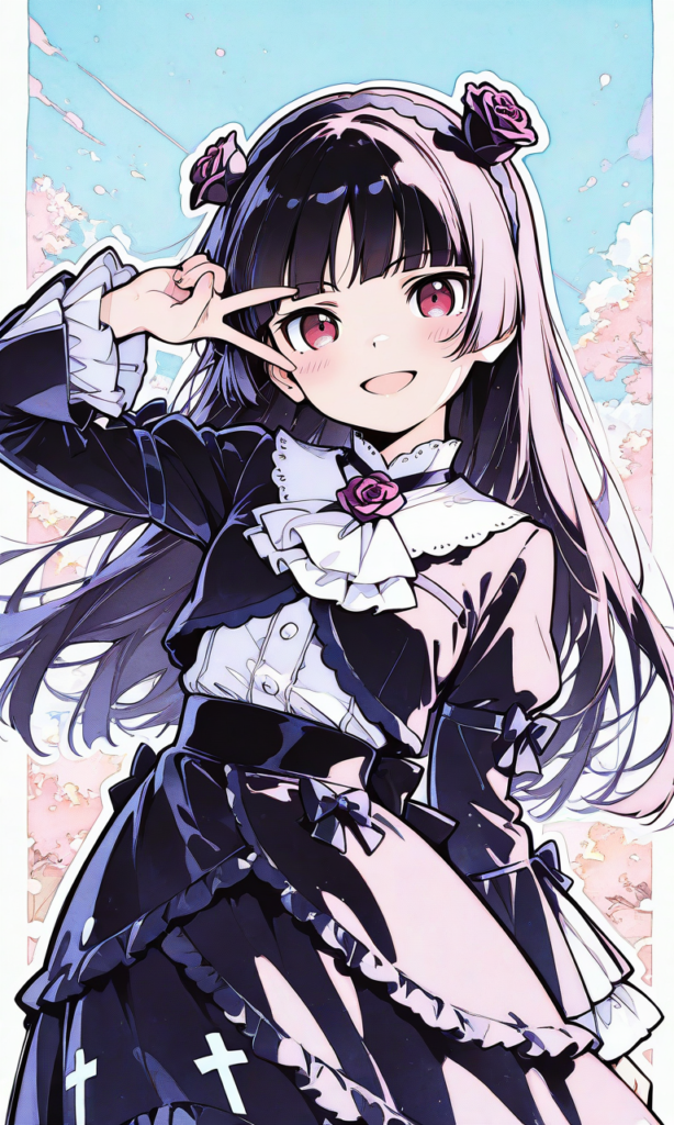 PixAI【Shiitake-Mix】ore no imouto,gokou ruri,((no ears)), gothic lolita,long skirt,smugness,open mouth, smile,v over eye, cowboy shot,masterpiece,high resolution,high quality, ,high-res,((sketch-like_outlines, watercolor_coloring, watercolor_texture, japanese_style, best_quality, ultra_detailed, lineart-heavy_style, sketch_style)),{masterpiece},{chibi} ,{chibi style anime illustration},{Deformed},{best quality}, {illustration},{thick outline},{outlined vector graphics},{2d cel anime},{flat color style},{simple coloring style},Only one person depicted, big eyes, a short limbs,