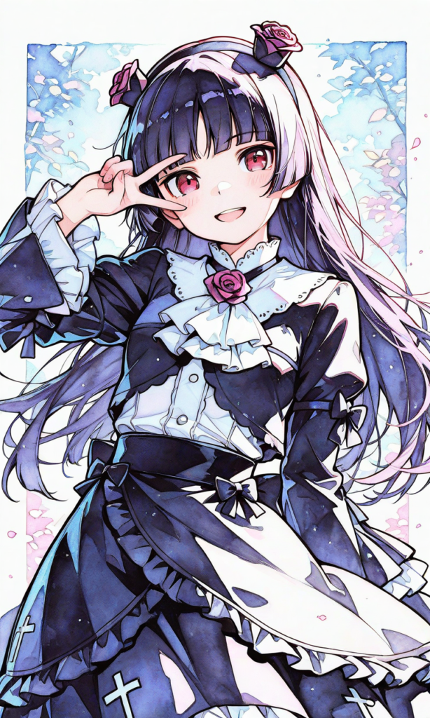ore no imouto,gokou ruri,((no ears)), gothic lolita,long skirt,smugness,open mouth, smile,v over eye, cowboy shot,masterpiece,high resolution,high quality, ,high-res,((sketch-like_outlines, watercolor_coloring, watercolor_texture, japanese_style, best_quality, ultra_detailed, lineart-heavy_style, sketch_style))