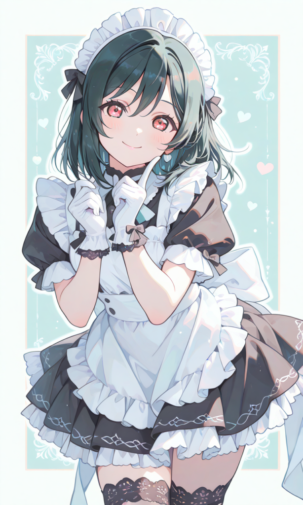 PixAI【Shiitake-Mix】(thick outline), (outlined vector graphics), mifune shioriko(lovelive), solo, maid, white gloves, lace thighhighs, smile, index finger raised, cowboy shot, masterpiece, high resolution, high quality, ♡masterpiece, highest quality, ♡, high-res, pastel style