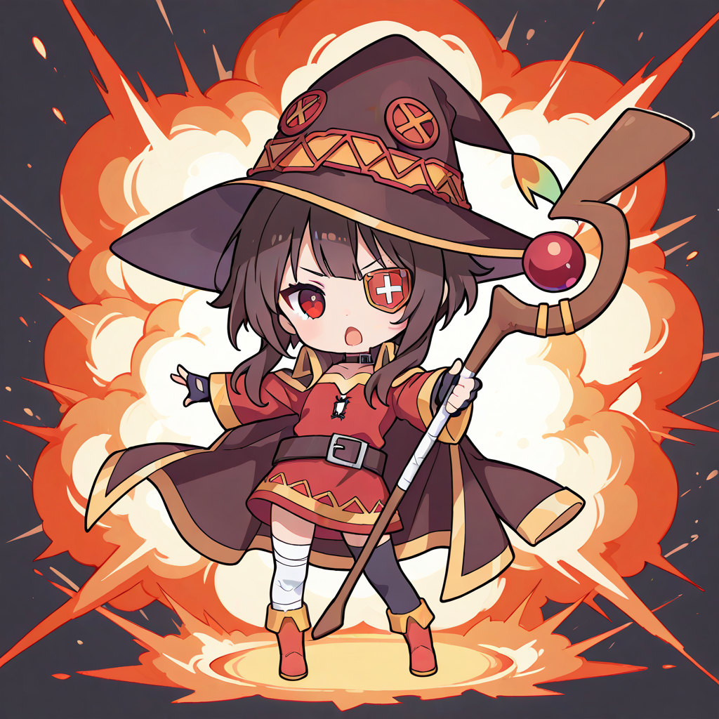 PixAI【Shiitake-Mix】megumin,((chibi)),((((solo)))), serious, open mouth,eyepatch,hat,full body,holding staff,coat, explosion,outstretched arm, minimalism, masterpiece,high quality,high resolution ,♡masterpiece, highest quality, ♡,pastel style