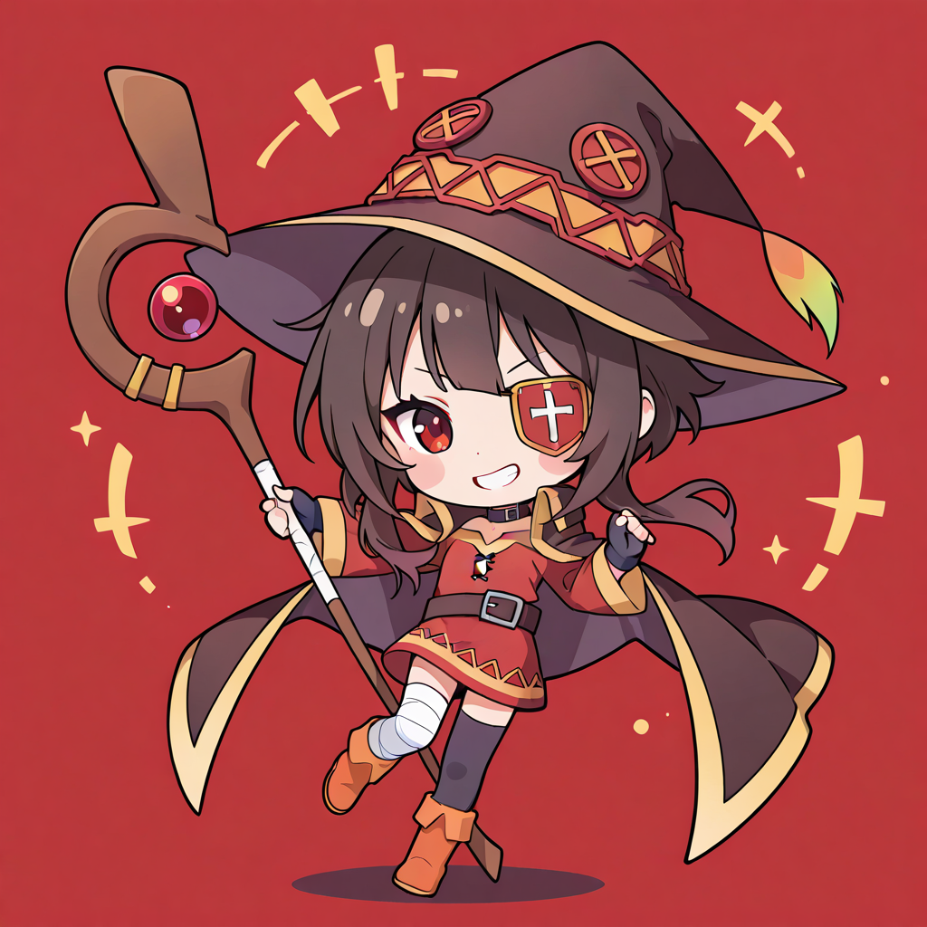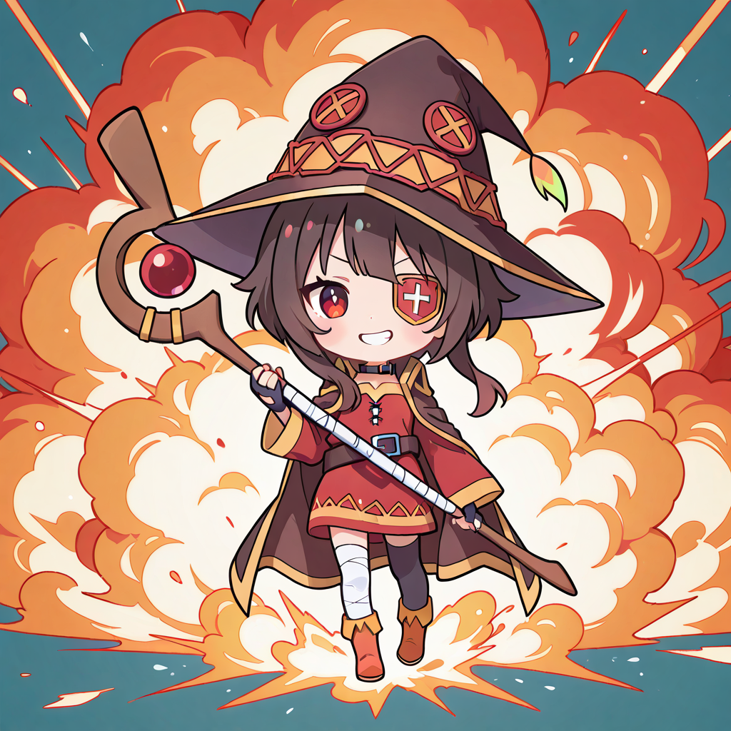 megumin,((chibi)),((((solo)))), grin,eyepatch,hat,full body,holding staff,coat, explosion, minimalism, masterpiece,high quality,high resolution ,♡masterpiece, highest quality, ♡,pastel style