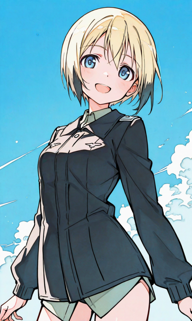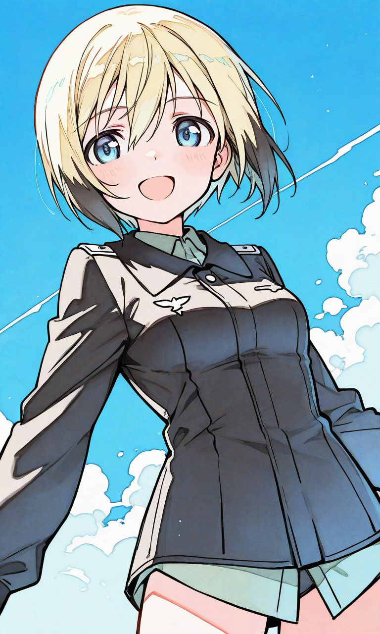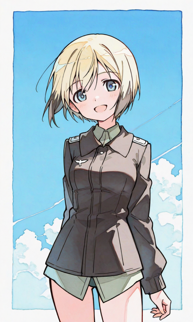 PixAI【Shiitake-Mix】STRIKE WITCHES,Erica Hartmann,smile,open mouth,looking at viewer, cowboy shot,blue sky, masterpiece,high quality, high resolution,erica hartmann, short hair, blue eyes, blonde hair, bob cut, medium breasts,high-res,((sketch-like_outlines, watercolor_coloring, watercolor_texture, japanese_style, best_quality, ultra_detailed, lineart-heavy_style, sketch_style))
