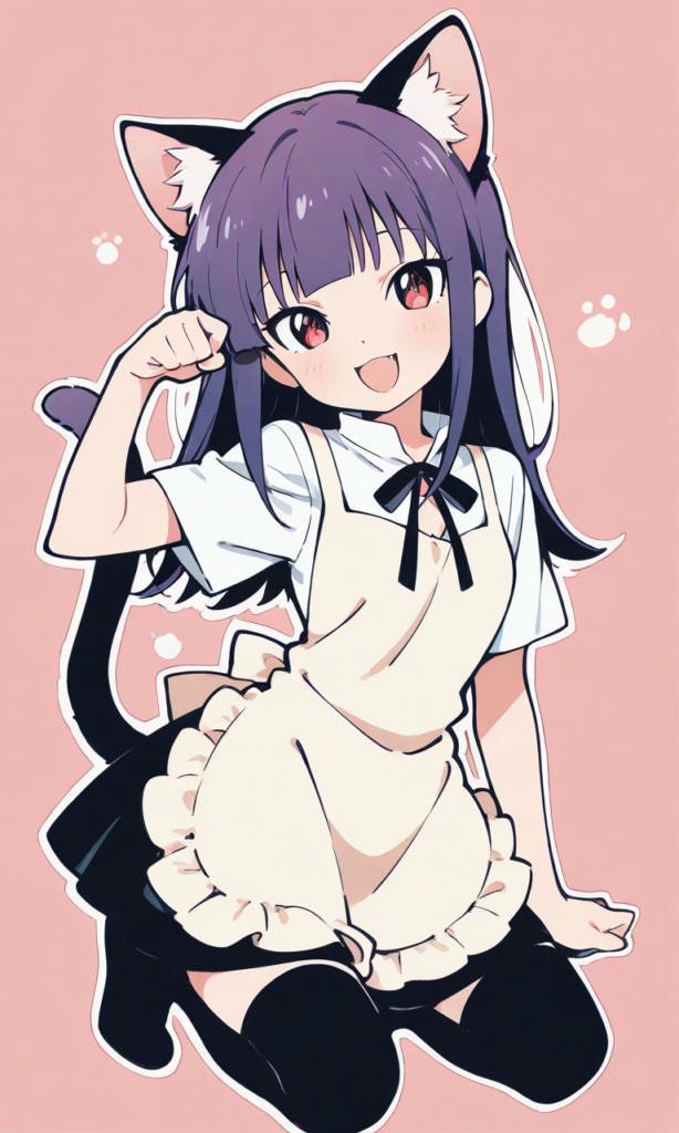 PixAI【Shiitake-Mix】{thick outline},{outlined vector graphics},{2d cel anime},{flat color style),WORKING!! ,yamada aoi,((solo)),purple hair, smile,open mouth,looking at viewer, cat ears, black thighhighs, lucky cat,pose,kneeling, cowboy shot,masterpiece,high resolution,high quality, ,high-res,{masterpiece},{chibi} ,{chibi style anime illustration},{Deformed},{best quality}, {illustration},{thick outline},{outlined vector graphics},{2d cel anime},{flat color style},{simple coloring style},Only one person depicted, big eyes, a short limbs,
