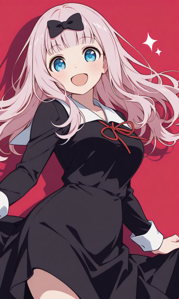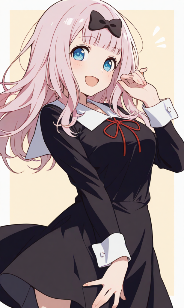 PixAI【Shiitake-Mix】flat color, cel shading, fujiwara chika, collared dress, shuuchiin academy school uniform,long sleeves, smile,open mouth, cowboy shot, looking at viewer, masterpiece,high resolution,high quality, ,high-res,