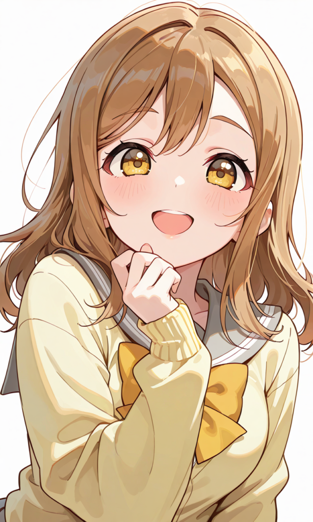 PixAI【Shiitake-Mix】lovelive,kunikida hanamaru, uranohoshi school uniform, yellow cardigan,smile,open mouth,upper body, simplebackground,masterpiece,high quality, high resolution,♡masterpiece, highest quality, ♡