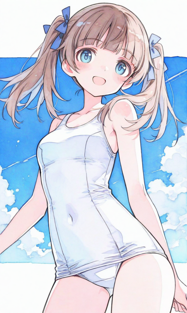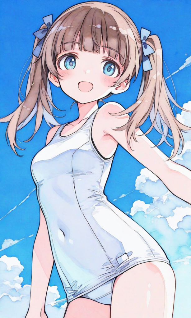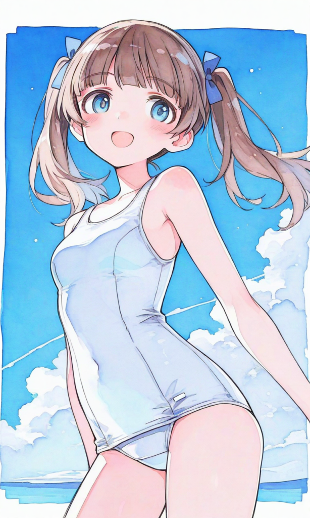 PixAI【Shiitake-Mix】STRIKE WITCHES,shimada fumikane (style), georgette lemare,smile,open mouth,looking at viewer, cowboy shot,blue sky, masterpiece,high quality, high resolution,high-res,watercolor, sketch style, watercolor effect, pastel colors,georgette lemare,brown hair,blue eyes,twintails,white school swimsuit,((sketch-like_outlines, watercolor_coloring, watercolor_texture, japanese_style, best_quality, ultra_detailed, lineart-heavy_style, sketch_style))