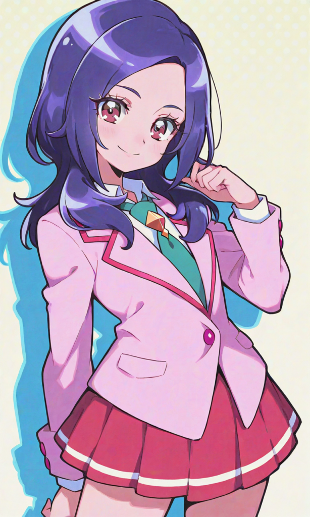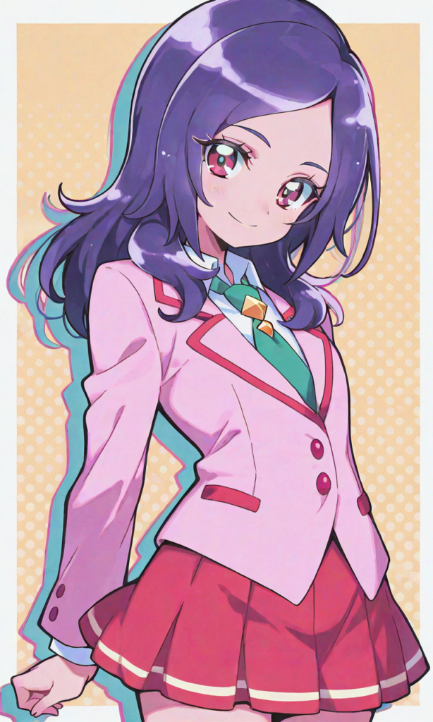 PixAI【Shiitake-Mix】higashi setsuna(precure),solo, smile, school uniform,pink blazer,red miniskirt,green necktie, cowboy shot,drop shadow, polka dot background, masterpiece,high resolution,high quality, ,high-res,neon pop art style,