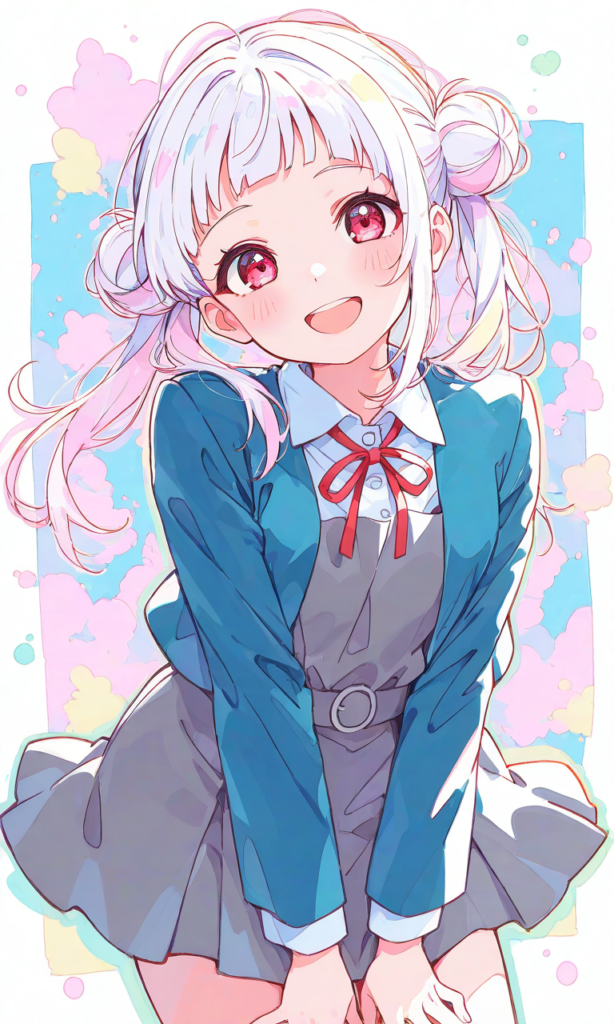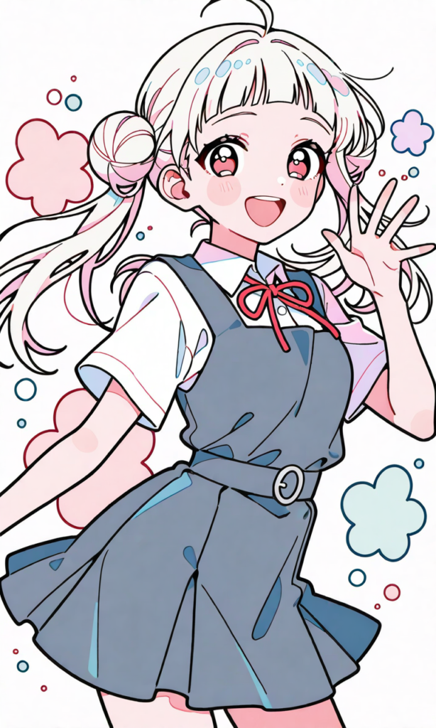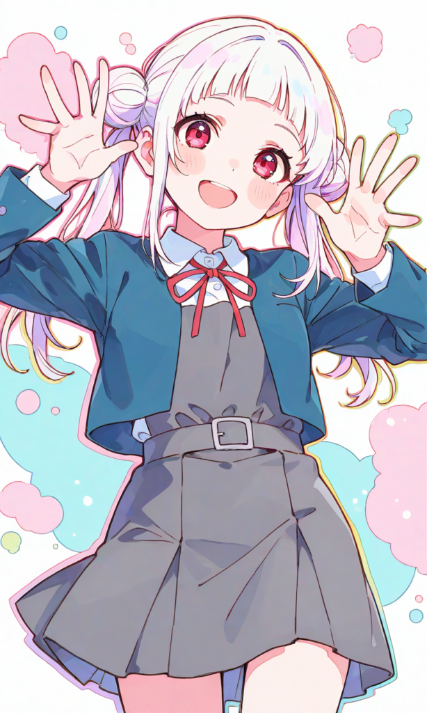 lovelive,arashi chisato,yuigaoka school uniform,short sleeves, smile,open mouth, cowboy shot,masterpiece,high resolution,high quality, ,high-res,cute aesthetic style, cute style, aesthetic, soft colors, pastel colors, kawaii style, kawaii pastel, cute forms, kawaii accessories, big eyes, cute eyes, retro style, colored lineart, colored outline, citypop, detailed clothes,