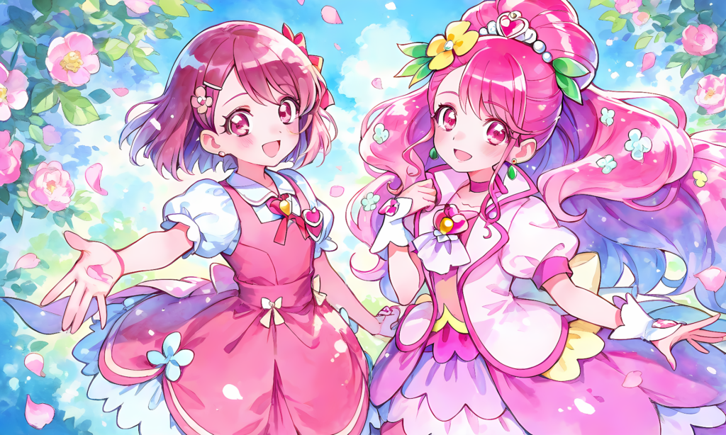 PixAI【Shiitake-Mix】2girls, ((hanadera nodoka))((pink pinafore dress)), cure grace, smile,open mouth,cowboy shot,looking at viewer,floating pink petal,leaf, masterpiece,high resolution,high quality, ,high-res,(watercolor_(medium):1.2)(simple coloring,flat color:2)dutch angle