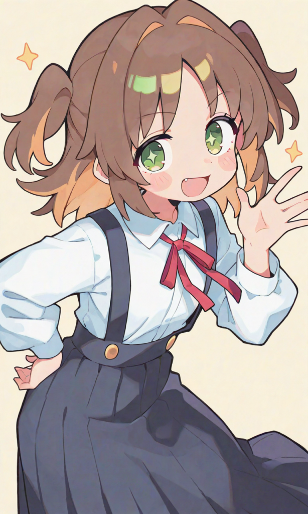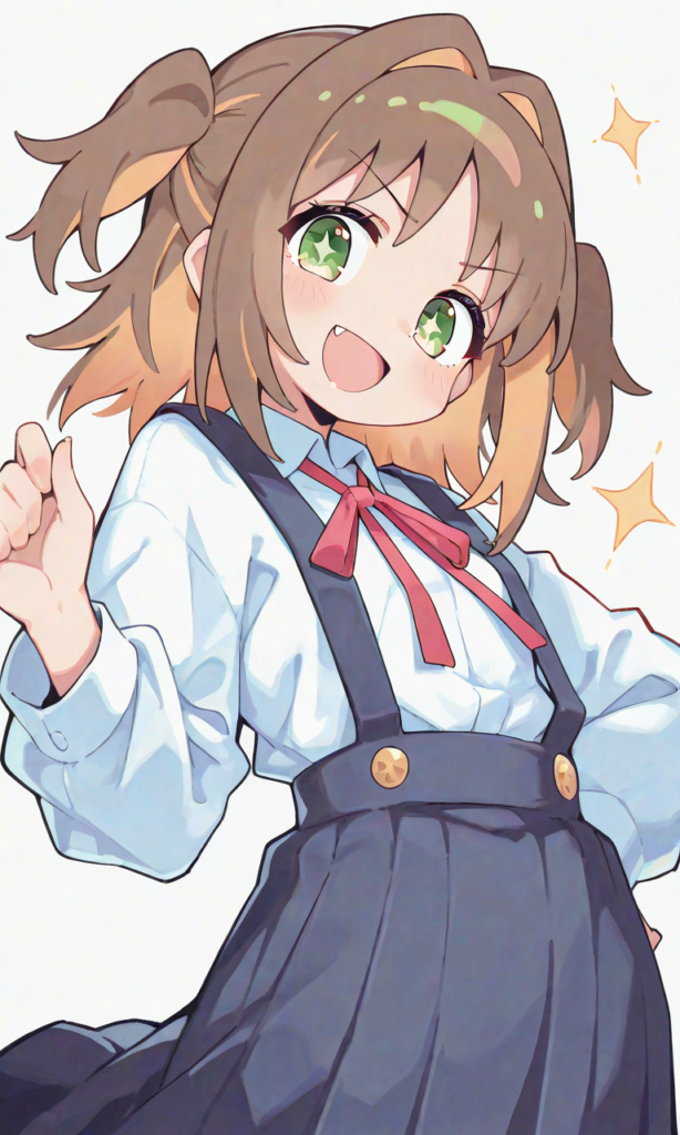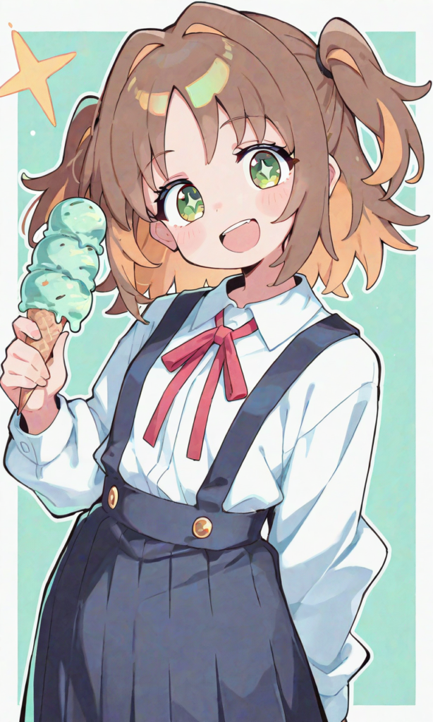 PixAI【Shiitake-Mix】oka asahi, short hair, smile, open mouth, looking at viewer, cowboy shot, holding ice cream(mint choco), simple background, masterpiece, high quality, high resolution, high-res, asahi-shirt, oka asahi, green eyes, sparkling pupils, brown hair, two side up, school uniform, white shirt, long sleeves, red neck ribbon, suspender skirt, suspenders, long skirt, neon pop art style