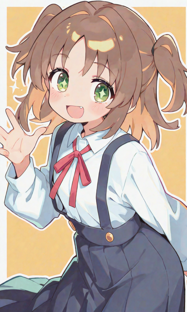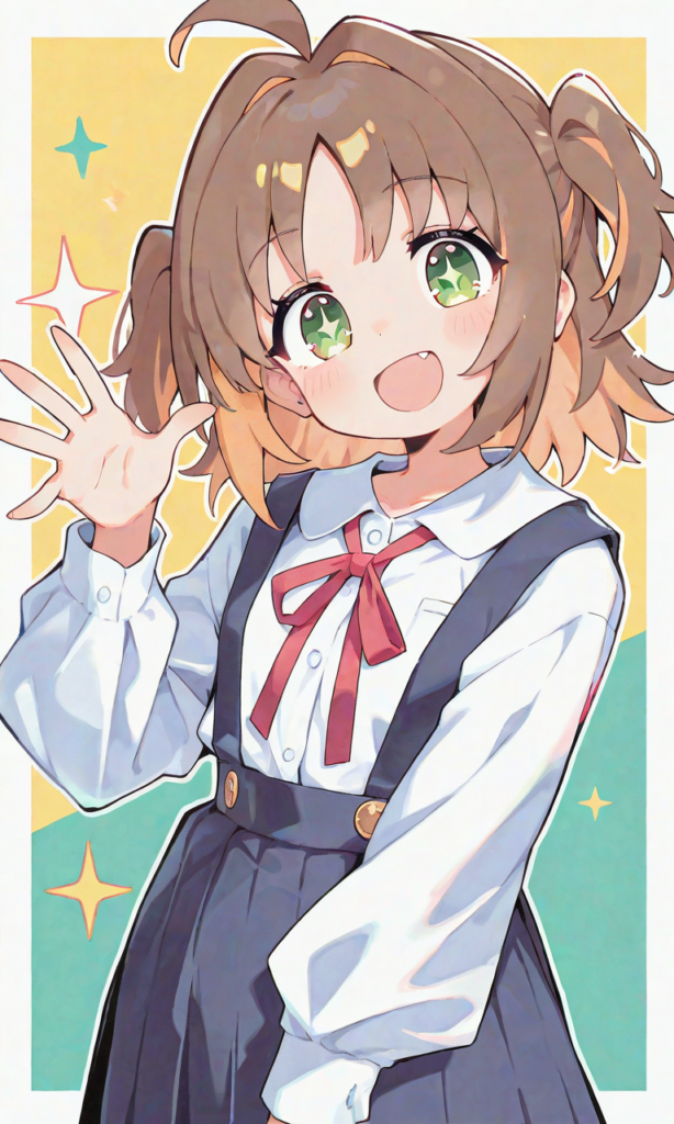 oka asahi, smile, open mouth, looking at viewer, cowboy shot, simple background, masterpiece, high quality, high resolution, high-res, asahi-shirt, green eyes, sparkling pupils, brown hair, two side up, school uniform, white shirt, long sleeves, red neck ribbon, suspender skirt, suspenders, long skirt, neon pop art style