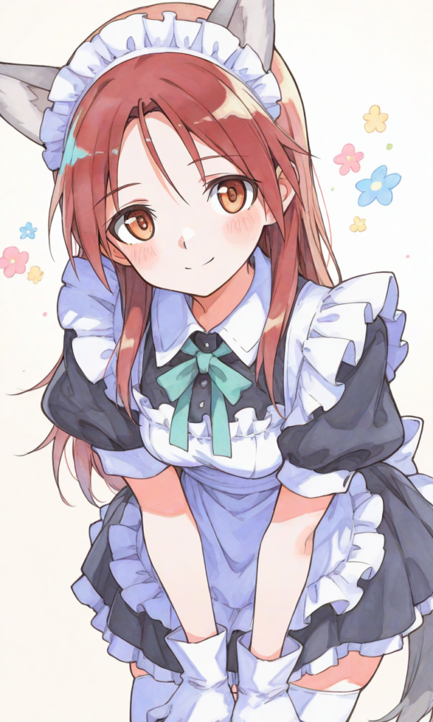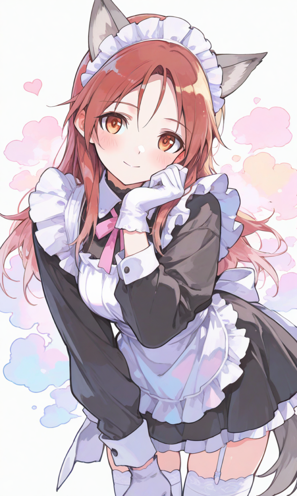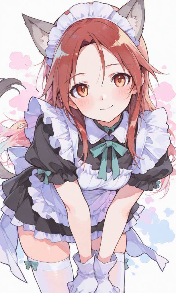 PixAI【Shiitake-Mix】minna-dietlinde wilcke(STRIKE WITCHES),maid,gray animal ears, white thighhighs, white gloves,leaning forward, smile,looking at viewer,cowboy shot,simplebackground,masterpiece,high quality, high resolution,high-res,watercolor, sketch style, watercolor effect, pastel colors,♡masterpiece, highest quality, ♡