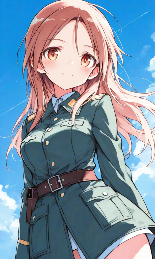 minna-dietlinde wilcke(STRIKE WITCHES),shimada fumikane (style), military uniform, smile,looking at viewer,no hair ornament, cowboy shot,blue sky, masterpiece,high quality, high resolution,high-res,watercolor, sketch style, watercolor effect, pastel colors,