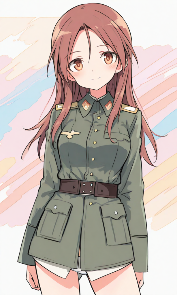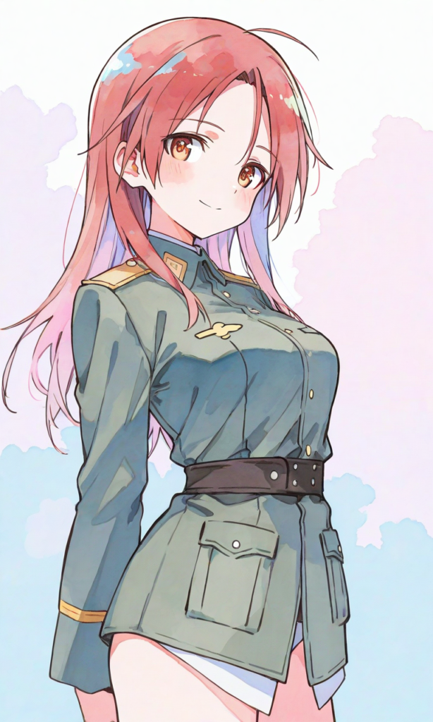 minna-dietlinde wilcke(STRIKE WITCHES),military uniform, smile,looking at viewer, cowboy shot,simplebackground,masterpiece,high quality, high resolution,high-res,watercolor, sketch style, watercolor effect, pastel colors