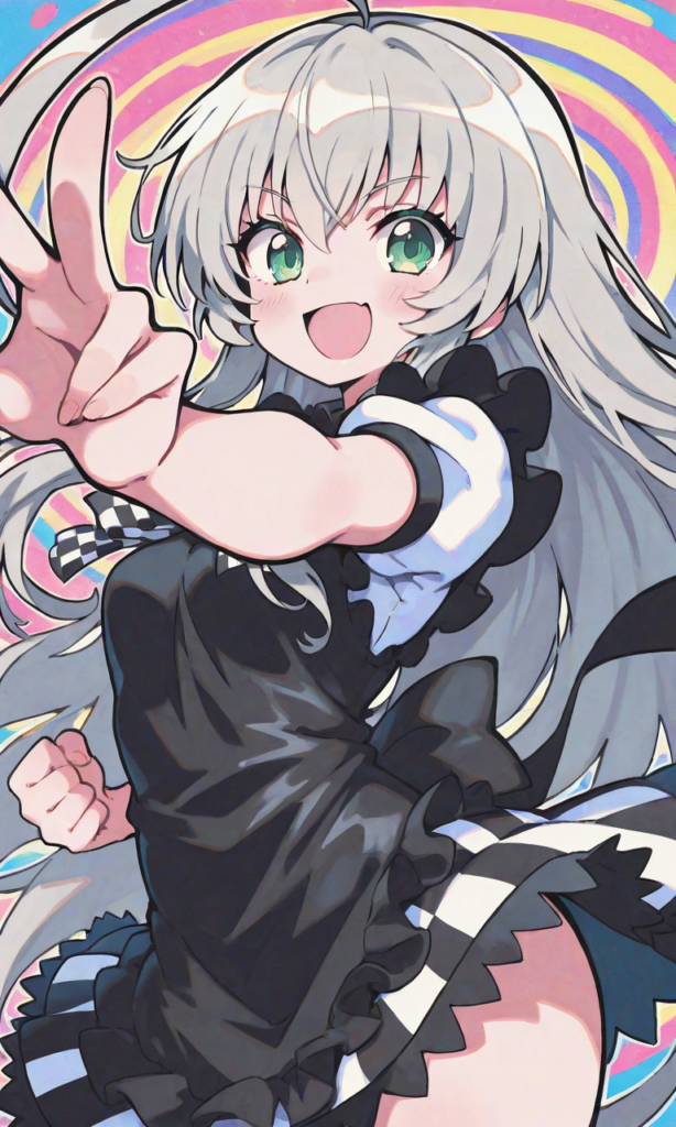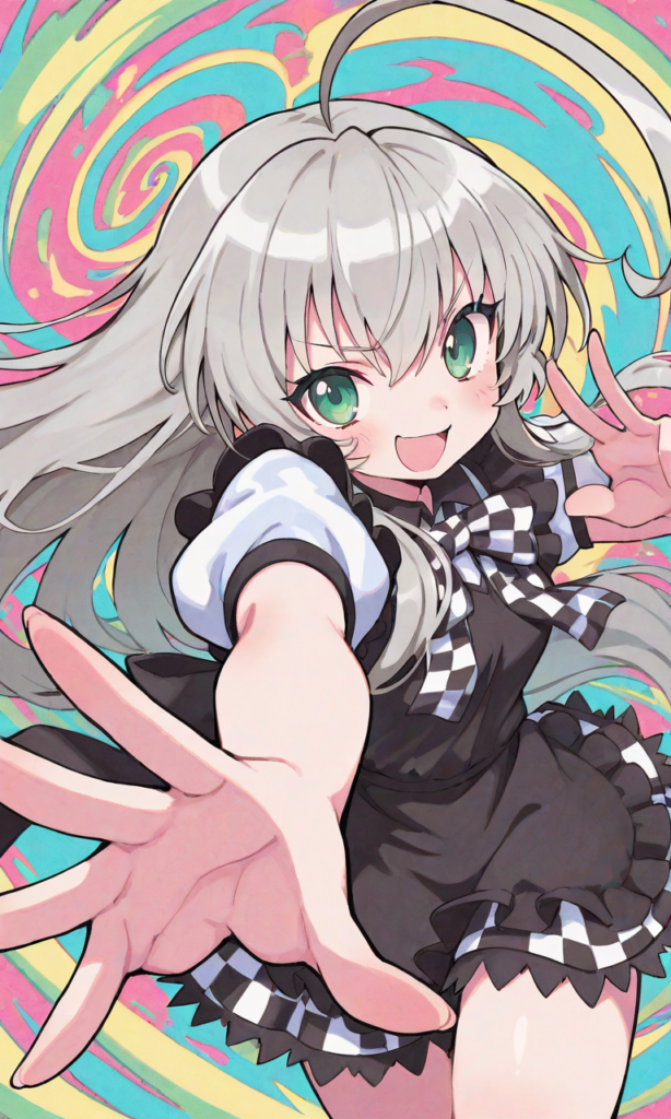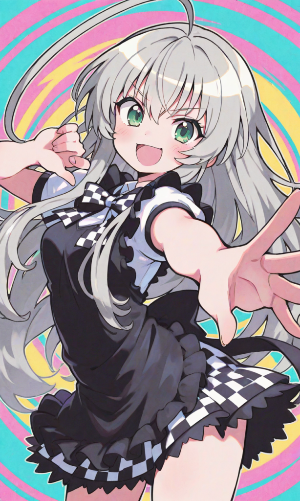 PixAI【Shiitake-Mix】nyarlathotep (nyaruko-san), smile,open mouth,henshin pose, foreshortening, cowboy shot,spiral background, masterpiece,high resolution,high quality, ,high-res,neon pop art style