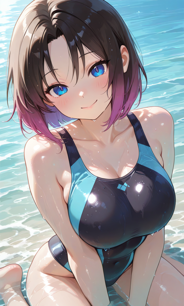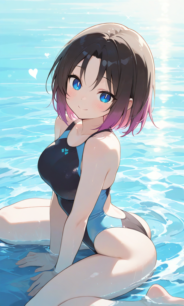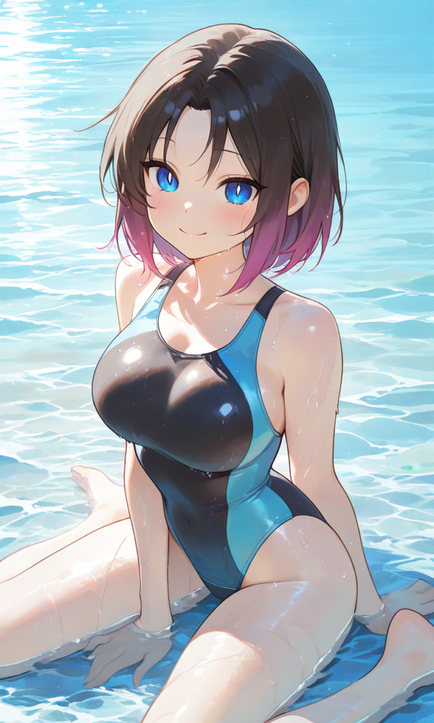 PixAI【Shiitake-Mix】elma (maidragon),no tail,competition swimsuit,large breast,smile,wariza, water,wet, cowboy shot,masterpiece,high resolution,high quality, ,♡masterpiece, highest quality, ♡,high-res,high levels of detail in the skin’s texture,anime-inspired, focus on realistic anatomy and detailed features,1girl, high quality, ultra-detailed, soft shading, glossy skin, vibrant colors, realistic lighting, close-up composition, natural highlights, smooth rendering, anime style, wet effect, upper body focus