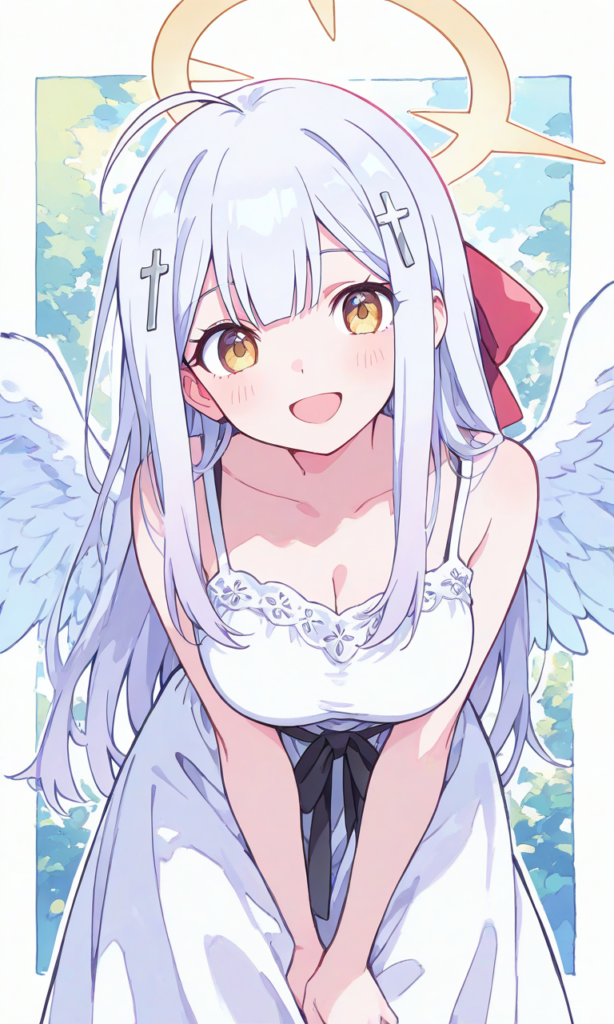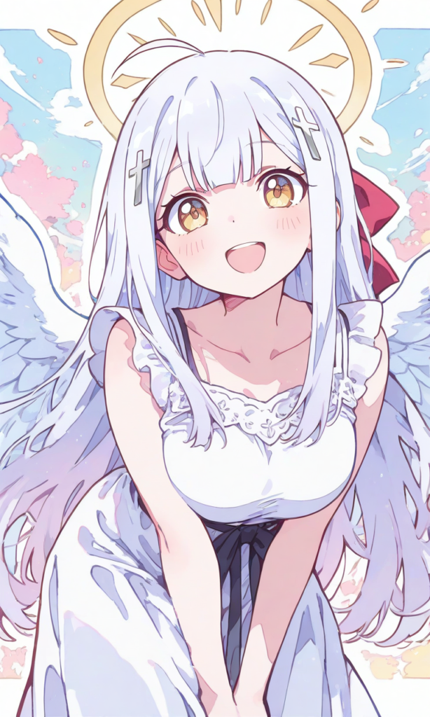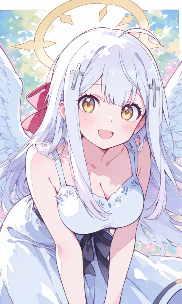 raphiel shiraha ainsworth,((solo)), smile,open mouth,angel wings, yellow halo, leaning forward, white dress,long skirt, cowboy shot,masterpiece,high quality, high resolution ,, raphiel shiraha ainsworth, long hair, ahoge, white hair, hair ornament, cross hair ornament, yellow eyes, large breasts,high-res,watercolor, sketch style, watercolor effect, pastel colors,{masterpiece},{chibi} ,{chibi style anime illustration},{Deformed},{best quality}, {illustration},{thick outline},{outlined vector graphics},{2d cel anime},{flat color style},{simple coloring style},Only one person depicted, big eyes, a short limbs,raphiel shiraha ainsworth,((solo)), smile,open mouth,angel wings, yellow halo, leaning forward, white dress,long skirt, cowboy shot,masterpiece,high quality, high resolution ,, raphiel shiraha ainsworth, long hair, ahoge, white hair, hair ornament, cross hair ornament, yellow eyes, large breasts,high-res,watercolor, sketch style, watercolor effect, pastel colors,{masterpiece},{chibi} ,{chibi style anime illustration},{Deformed},{best quality}, {illustration},{thick outline},{outlined vector graphics},{2d cel anime},{flat color style},{simple coloring style},Only one person depicted, big eyes, a short limbs,