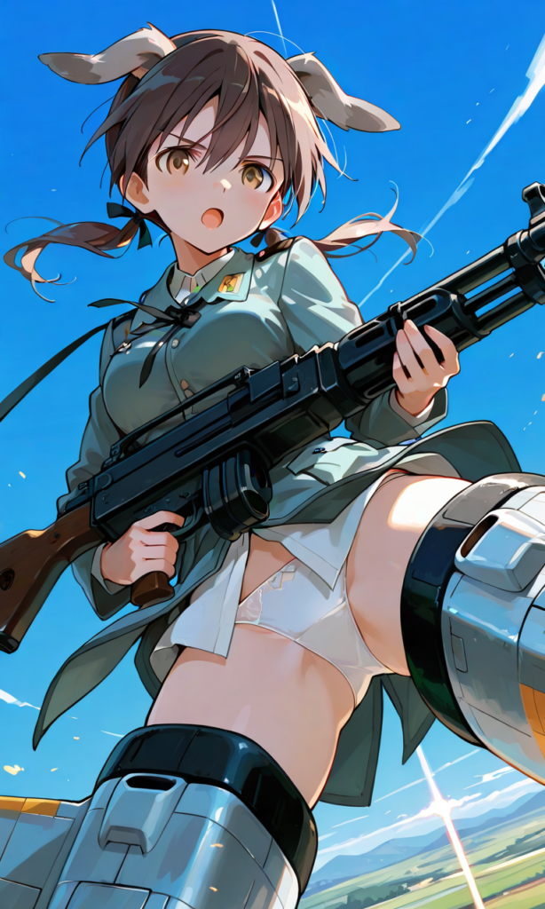 PixAI【Shiitake-Mix】STRIKE WITCHES,Gertrud Barkhorn,dog ears, brown eyes,White panties, striker unit,serious, open mouth, flying,blue sky,holding weapon,((heavy machine gun)), open legs, dynamic pose, looking at viewer,incoming attack, masterpiece,high resolution,high quality, ,cinematic lighting , cinematic angle, soft light , color detail, backlighting, Depth of field, long exposure, light steps, intricate colors, vibrant colors,748cmstyle