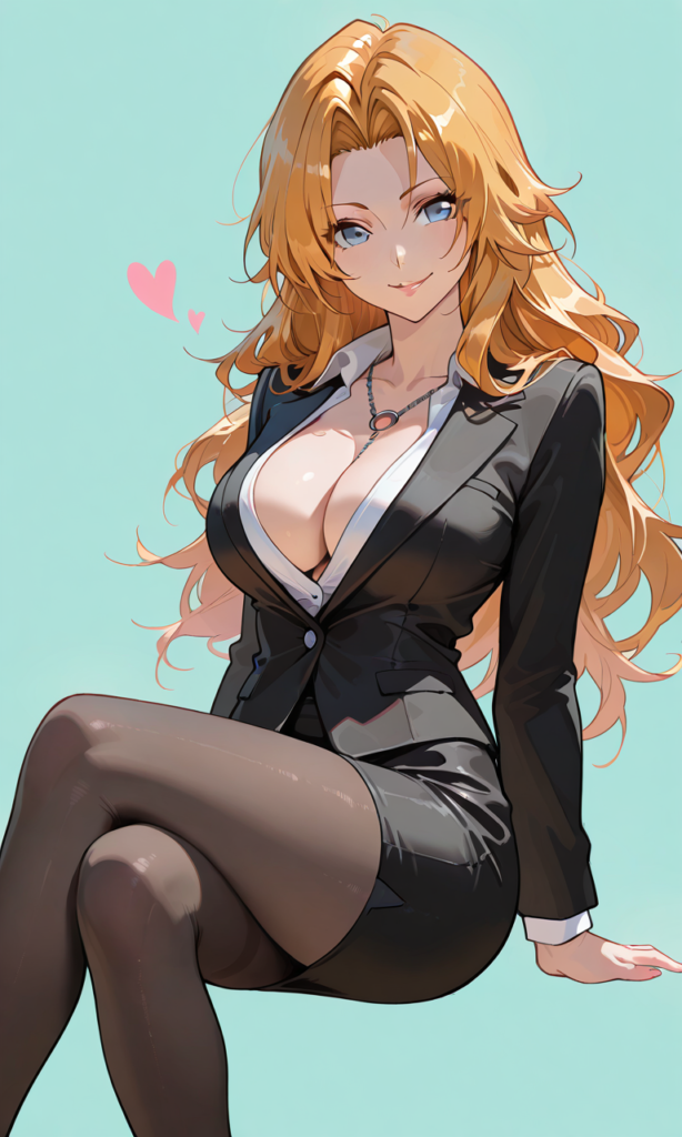 PixAI【Shiitake-Mix】BLEACH,matsumoto rangiku,smile,teacher, pencil skirt,pantyhose,crossed legs, sitting, invisible chair, cowboy shot,((simplebackground)),masterpiece,high quality, high resolution,♡masterpiece, highest quality, ♡