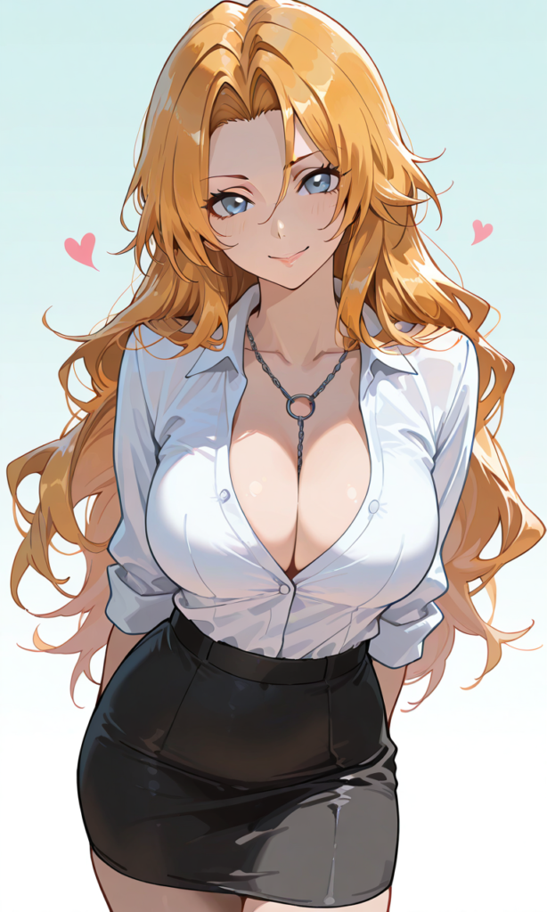 BLEACH,matsumoto rangiku,smile,teacher, pencil skirt, cowboy shot,((simplebackground)),masterpiece,high quality, high resolution,♡masterpiece, highest quality, ♡