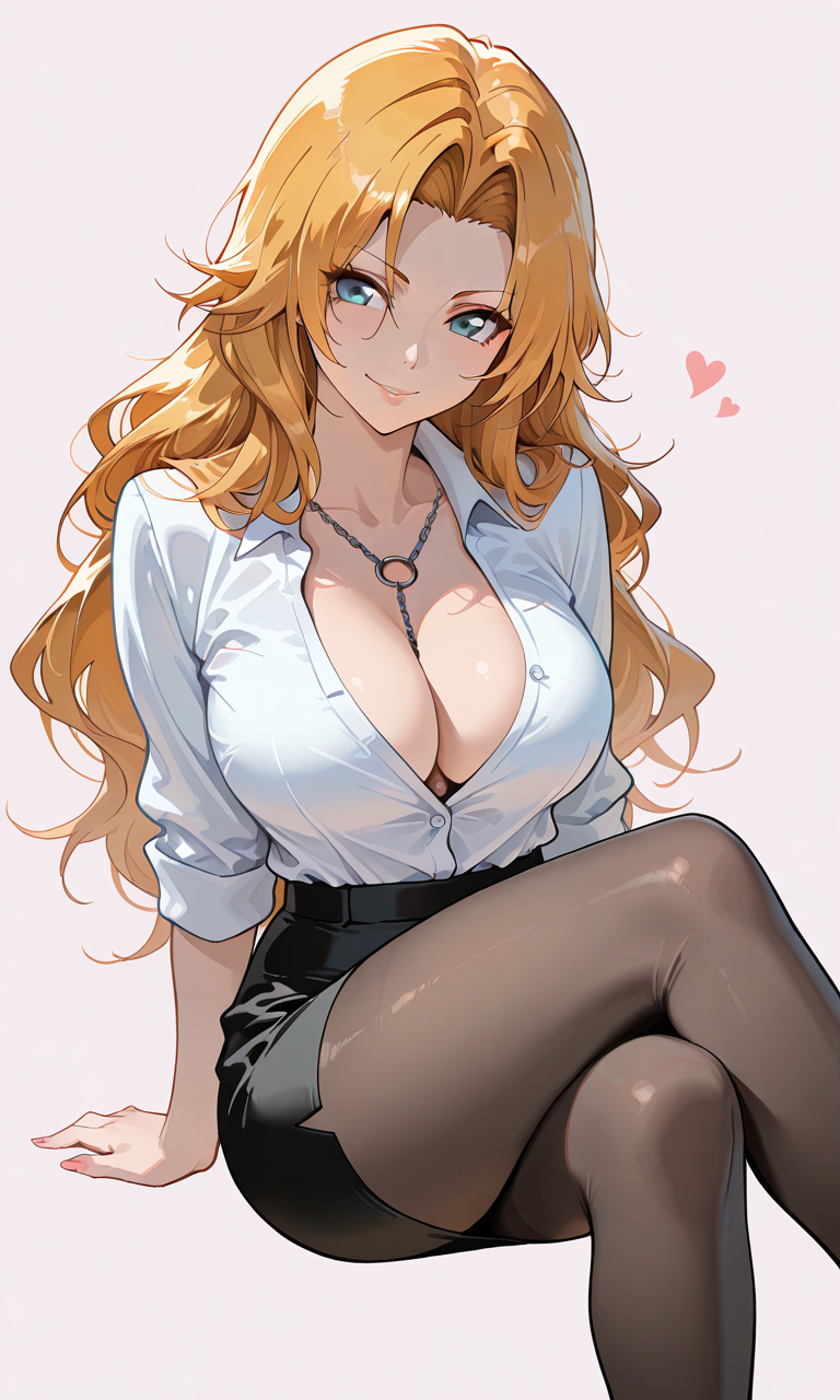 PixAI【Shiitake-Mix】BLEACH,matsumoto rangiku,smile,teacher, pencil skirt,pantyhose,crossed legs, sitting, invisible chair, cowboy shot,((simplebackground)),masterpiece,high quality, high resolution,♡masterpiece, highest quality, ♡